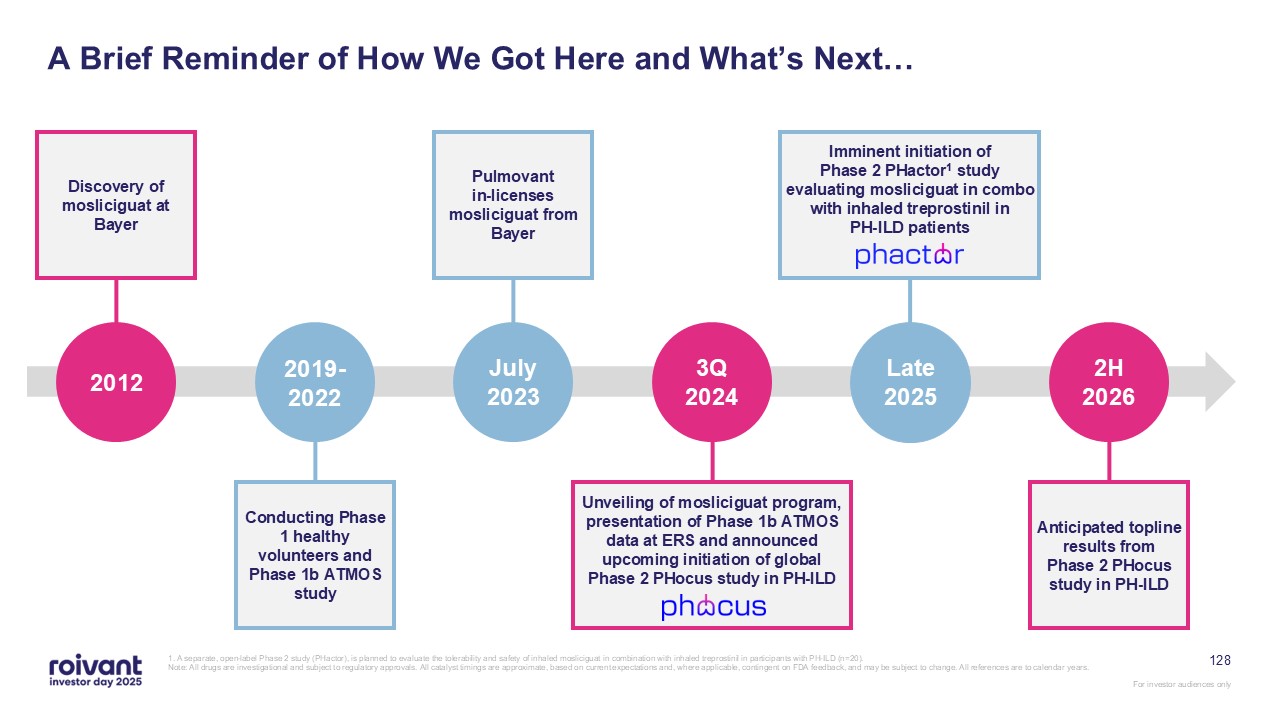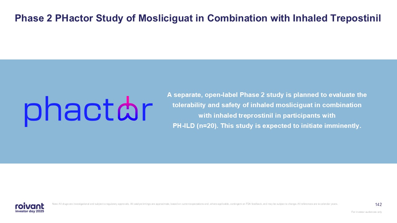 Phase 2 PHactor Study of Mosliciguat in Combination with Inhaled Trepostinil  A separate, open-label Phase 2 study is planned to evaluate the tolerability and safety of inhaled mosliciguat in combination with inhaled treprostinil in participants with PH-ILD (n=20). This study is expected to initiate imminently.  Note: All drugs are investigational and subject to regulatory approvals. All catalyst timings are approximate, based on current expectations and, where applicable, contingent on FDA feedback, and may be subject to change. All references are to calendar years.  142