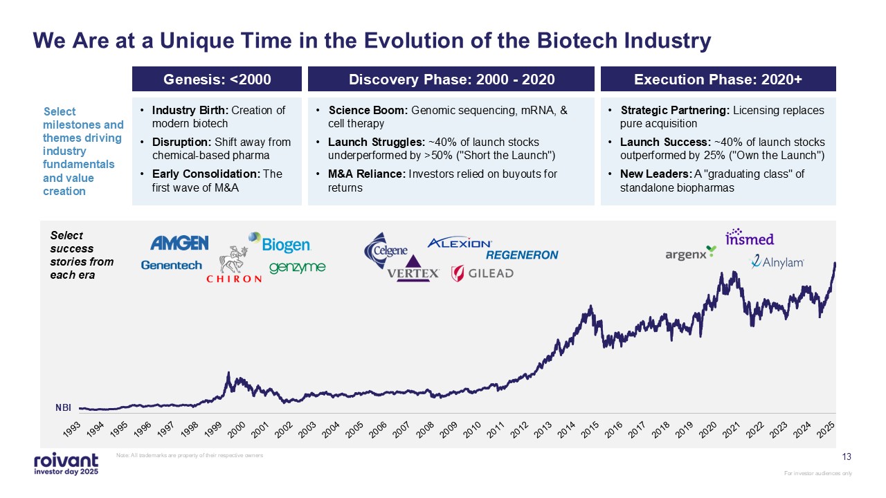 Select success stories from each era  13  We Are at a Unique Time in the Evolution of the Biotech Industry  Note: All trademarks are property of their respective owners  Genesis: <2000  Strategic Partnering: Licensing replaces pure acquisition  Launch Success: ~40% of launch stocks outperformed by 25% ("Own the Launch")  New Leaders: A "graduating class" of standalone biopharmas   Select milestones and themes driving industry fundamentals and value creation   NBI  Science Boom: Genomic sequencing, mRNA, & cell therapy  Launch Struggles: ~40% of launch stocks underperformed by >50% ("Short the Launch")  M&A Reliance: Investors relied on buyouts for returns  Industry Birth: Creation of modern biotech  Disruption: Shift away from chemical-based pharma  Early Consolidation: The first wave of M&A  Discovery Phase: 2000 - 2020  Execution Phase: 2020+