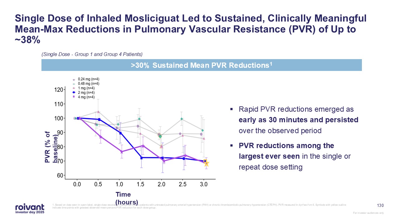 130  (Single Dose - Group 1 and Group 4 Patients)  Single Dose of Inhaled Mosliciguat Led to Sustained, Clinically Meaningful Mean-Max Reductions in Pulmonary Vascular Resistance (PVR) of Up to ~38%  1. Based on data seen in open-label, single-dose escalation multicenter trial in patients with untreated pulmonary arterial hypertension (PAH) or chronic thromboembolic pulmonary hypertension (CTEPH). PVR measured in dyn*sec*cm-5. Symbols with yellow outline indicate time points with greatest observed mean percent PVR reduction for each dose group.  >30% Sustained Mean PVR Reductions1  Rapid PVR reductions emerged as early as 30 minutes and persisted over the observed period  PVR reductions among the largest ever seen in the single or repeat dose setting   PVR (% of baseline)  Time (hours)