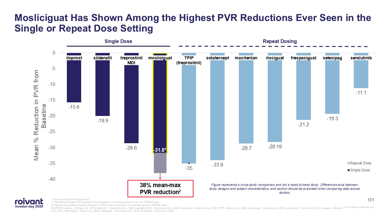 131  Mosliciguat Has Shown Among the Highest PVR Reductions Ever Seen in the Single or Repeat Dose Setting  *  -31.81  * indicates trough PVR observation.  1. Represents average PVR reduction for participants in 4 mg dose group at hour 3 in ATMOS study.  2. Represents average of largest reduction in PVR for each participant in 2 mg dose group in ATMOS study.  SOURCES: iloprost – Richter et al., 2015; sildenafil – Voswinckel et al., 2008; treprostinil MDI - Voswinckel et al., 2009; mosliciguat – Ghofrani et al., 2024; TPIP – Grünig et al., 2025; sotatercept – Humbert et al., 2021; macitentan – Pulido et al., 2013; riociguat – Ghofrani et al., 2013; frespaciguat – Bajwa et al., 2024; selexipag – Simonneau et al., 2012; seralutinib – Frantz et al., 2024.  Figure represents a cross-study comparison and not a head-to-head study. Differences exist between study designs and subject characteristics, and caution should be exercised when comparing data across studies.   Single Dose  Repeat Dosing  38% mean-max PVR reduction2  *  -31.81
