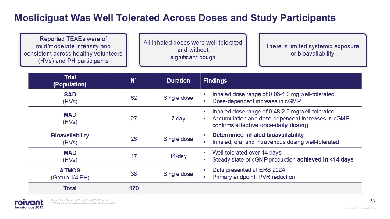 133  Mosliciguat Was Well Tolerated Across Doses and Study Participants  Results from Phase 1 SAD, MAD and ATMOS studies.  1. Numbers do not include subjects randomized to placebo.  Reported TEAEs were of mild/moderate intensity and consistent across healthy volunteers (HVs) and PH participants  All inhaled doses were well tolerated and without significant cough  There is limited systemic exposure or bioavailability  Trial(Population)  N1  Duration  Findings  SAD(HVs)  62  Single dose  Inhaled dose range of 0.06-4.0 mg well-tolerated  Dose-dependent increase in cGMP  MAD(HVs)  27  7-day  Inhaled dose range of 0.48-2.0 mg well-tolerated  Accumulation and dose-dependent increases in cGMP confirms effective once-daily dosing  Bioavailability(HVs)  26  Single dose  Determined inhaled bioavailability  Inhaled, oral and intravenous dosing well-tolerated  MAD(HVs)  17  14-day  Well-tolerated over 14 days  Steady state of cGMP production achieved in <14 days  ATMOS(Group 1/4 PH)  38  Single dose  Data presented at ERS 2024  Primary endpoint: PVR reduction  Total  170