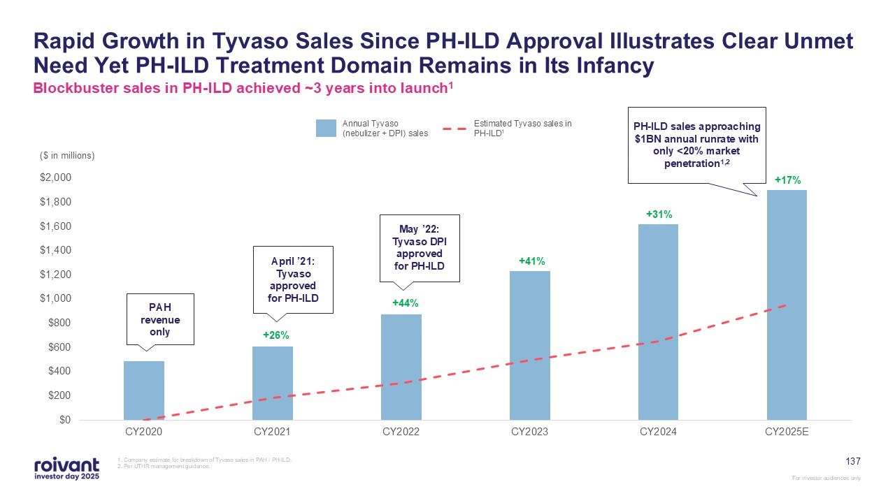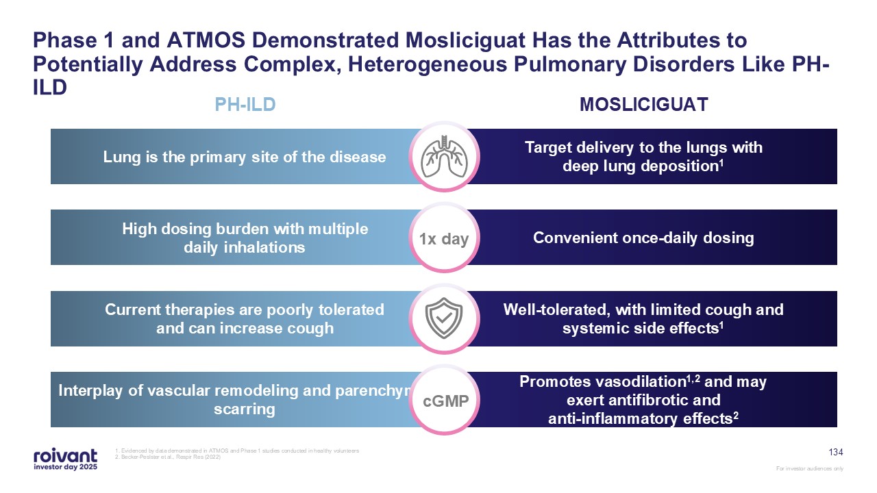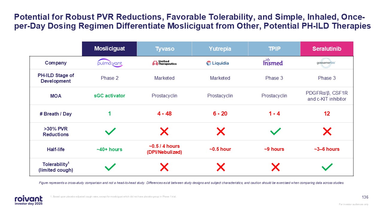 136  Potential for Robust PVR Reductions, Favorable Tolerability, and Simple, Inhaled, Once-per-Day Dosing Regimen Differentiate Mosliciguat from Other, Potential PH-ILD Therapies  Figure represents a cross-study comparison and not a head-to-head study. Differences exist between study designs and subject characteristics, and caution should be exercised when comparing data across studies.   Mosliciguat  Tyvaso  Yutrepia  TPIP  Seralutinib  Company  PH-ILD Stage of Development  Phase 2  Marketed  Marketed  Phase 3  Phase 3  MOA  sGC activator  Prostacyclin  Prostacyclin  Prostacyclin  PDGFRα/β, CSF1R and c-KIT inhibitor   # Breath / Day  1  4 - 48  6 - 20  1 - 4  12  >30% PVR Reductions  Half-life  ~40+ hours  ~0.5 / 4 hours (DPI/Nebulized)  ~0.5 hour  ~9 hours  ~3–6 hours  Tolerability1 (limited cough)  1. Based upon placebo-adjusted cough rates, except for mosliciguat which did not have placebo group in Phase 1 trial.