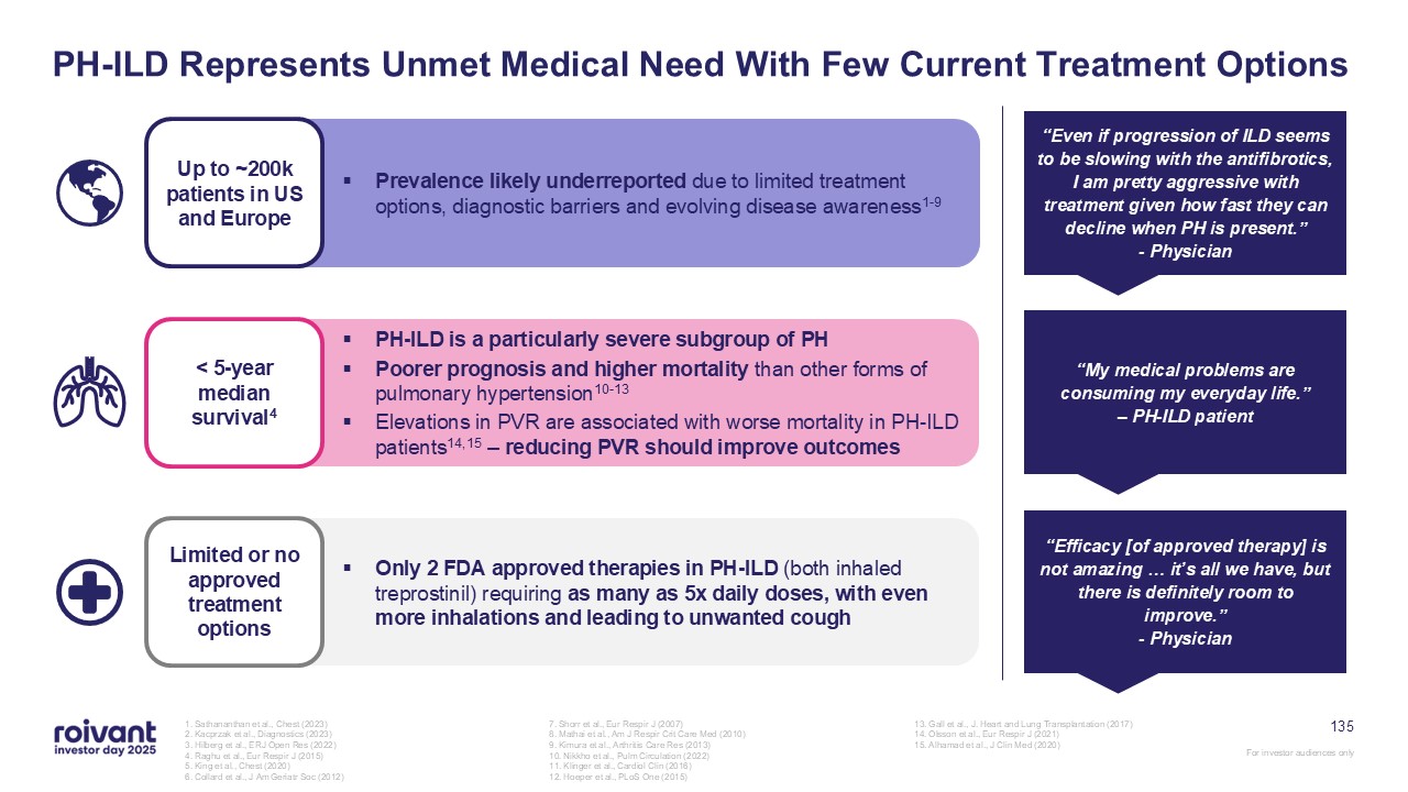 135  PH-ILD Represents Unmet Medical Need With Few Current Treatment Options  1. Sathananthan et al., Chest (2023)  2. Kacprzak et al., Diagnostics (2023)  3. Hilberg et al., ERJ Open Res (2022)  4. Raghu et al., Eur Respir J (2015)  5. King et al., Chest (2020)  6. Collard et al., J Am Geriatr Soc (2012)  7. Shorr et al., Eur Respir J (2007)  8. Mathai et al., Am J Respir Crit Care Med (2010)   9. Kimura et al., Arthritis Care Res (2013)  10. Nikkho et al., Pulm Circulation (2022)  11. Klinger et al., Cardiol Clin (2016)  12. Hoeper et al., PLoS One (2015)  13. Gall et al., J. Heart and Lung Transplantation (2017)  14. Olsson et al., Eur Respir J (2021)  15. Alhamad et al., J Clin Med (2020)  “Even if progression of ILD seems to be slowing with the antifibrotics, I am pretty aggressive with treatment given how fast they can decline when PH is present.” - Physician  “My medical problems are consuming my everyday life.” – PH-ILD patient  “Efficacy [of approved therapy] is not amazing … it’s all we have, but there is definitely room to improve.”   - Physician  Limited or no approved treatment options  Only 2 FDA approved therapies in PH-ILD (both inhaled treprostinil) requiring as many as 5x daily doses, with even more inhalations and leading to unwanted cough  Up to ~200k patients in US and Europe  Prevalence likely underreported due to limited treatment options, diagnostic barriers and evolving disease awareness1-9  < 5-year median survival4  PH-ILD is a particularly severe subgroup of PH  Poorer prognosis and higher mortality than other forms of pulmonary hypertension10-13  Elevations in PVR are associated with worse mortality in PH-ILD patients14,15 – reducing PVR should improve outcomes