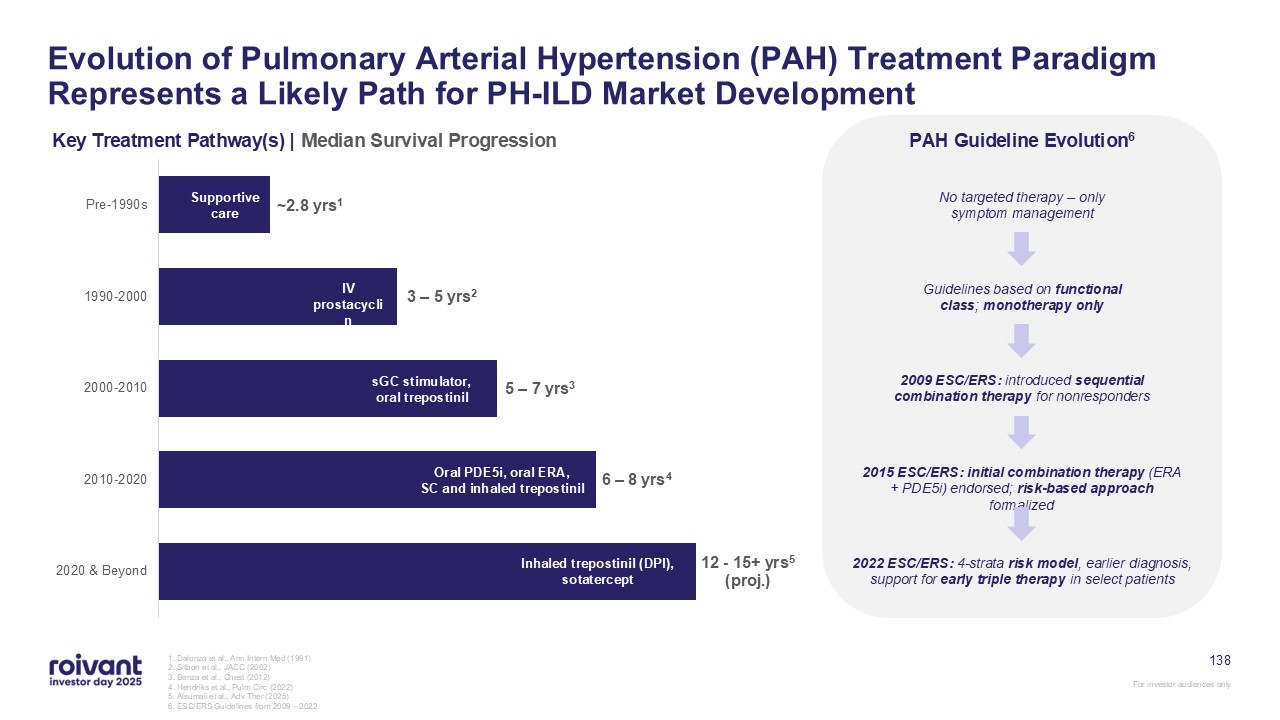 138  Evolution of Pulmonary Arterial Hypertension (PAH) Treatment Paradigm Represents a Likely Path for PH-ILD Market Development  Key Treatment Pathway(s) | Median Survival Progression  1. Dalonzo et al., Ann Intern Med (1991)  2. Sitbon et al., JACC (2002)  3. Benza et al., Chest (2012)  4. Hendriks et al., Pulm Circ (2022)  5. Alsumali et al., Adv Ther (2025)  6. ESC/ERS Guidelines from 2009 – 2022  Supportive care  IV prostacyclin  sGC stimulator, oral trepostinil  Oral PDE5i, oral ERA, SC and inhaled trepostinil  Inhaled trepostinil (DPI), sotatercept  PAH Guideline Evolution6  No targeted therapy – only symptom management  Guidelines based on functional class; monotherapy only  2009 ESC/ERS: introduced sequential combination therapy for nonresponders  2015 ESC/ERS: initial combination therapy (ERA + PDE5i) endorsed; risk-based approach formalized  2022 ESC/ERS: 4-strata risk model, earlier diagnosis, support for early triple therapy in select patients