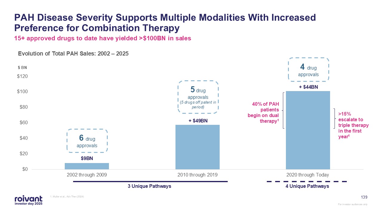 139  PAH Disease Severity Supports Multiple Modalities With Increased Preference for Combination Therapy  1. Muller et al., Adv Ther (2024)  Evolution of Total PAH Sales: 2002 – 2025  $9BN  + $49BN  + $44BN  6 drug approvals  5 drug approvals(5 drugs off patent in period)  4 drug approvals  $ BN  15+ approved drugs to date have yielded >$100BN in sales  3 Unique Pathways  4 Unique Pathways  40% of PAH patients begin on dual therapy1  >15% escalate to triple therapy in the first year1