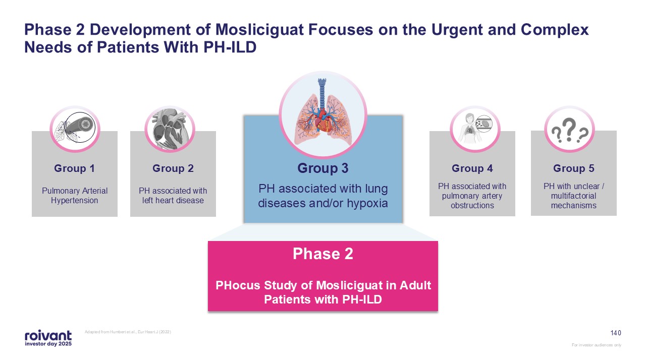 140  Phase 2 Development of Mosliciguat Focuses on the Urgent and Complex Needs of Patients With PH-ILD  Adapted from Humbert et al., Eur Heart J (2022)  Group 3  PH associated with lung diseases and/or hypoxia  Phase 2  PHocus Study of Mosliciguat in Adult Patients with PH-ILD  PH associated with left heart disease  PH associated with pulmonary artery obstructions  PH with unclear / multifactorial mechanisms  Group 2  Group 1  Group 4  Group 5  Pulmonary Arterial Hypertension