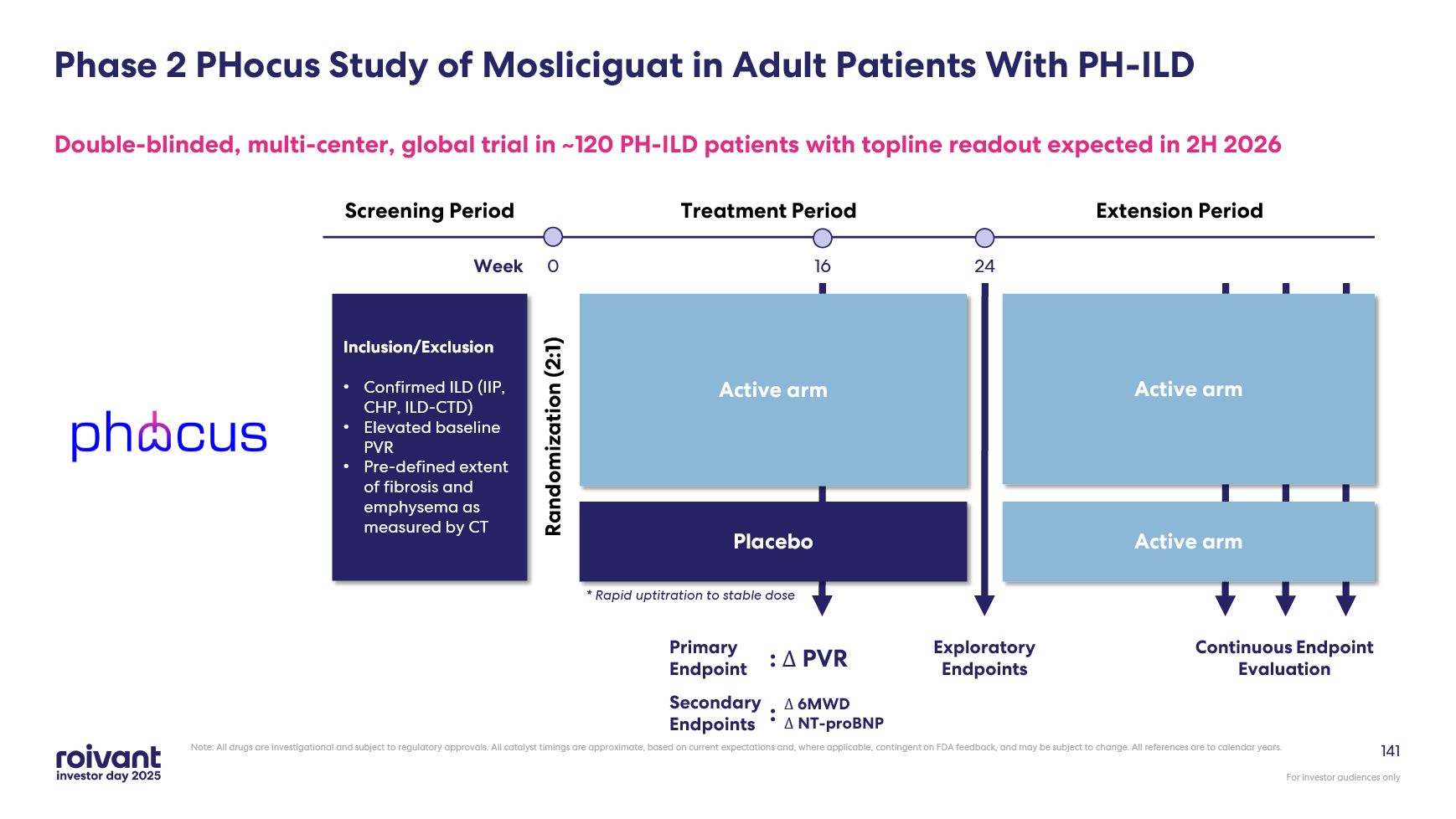 141  Phase 2 PHocus Study of Mosliciguat in Adult Patients With PH-ILD  Double-blinded, multi-center, global trial in ~120 PH-ILD patients with topline readout expected in 2H 2026  Extension Period  Treatment Period  Screening Period  Inclusion/Exclusion  Confirmed ILD (IIP, CHP, ILD-CTD)  Elevated baseline PVR  Pre-defined extent of fibrosis and emphysema as measured by CT  Randomization (2:1)  Week  0  16  24  Exploratory Endpoints  Placebo  Active arm  Primary Endpoint  : Δ PVR  Secondary Endpoints  Δ 6MWDΔ NT-proBNP  :  * Rapid uptitration to stable dose   Active arm  Active arm  Continuous Endpoint Evaluation  Note: All drugs are investigational and subject to regulatory approvals. All catalyst timings are approximate, based on current expectations and, where applicable, contingent on FDA feedback, and may be subject to change. All references are to calendar years.
