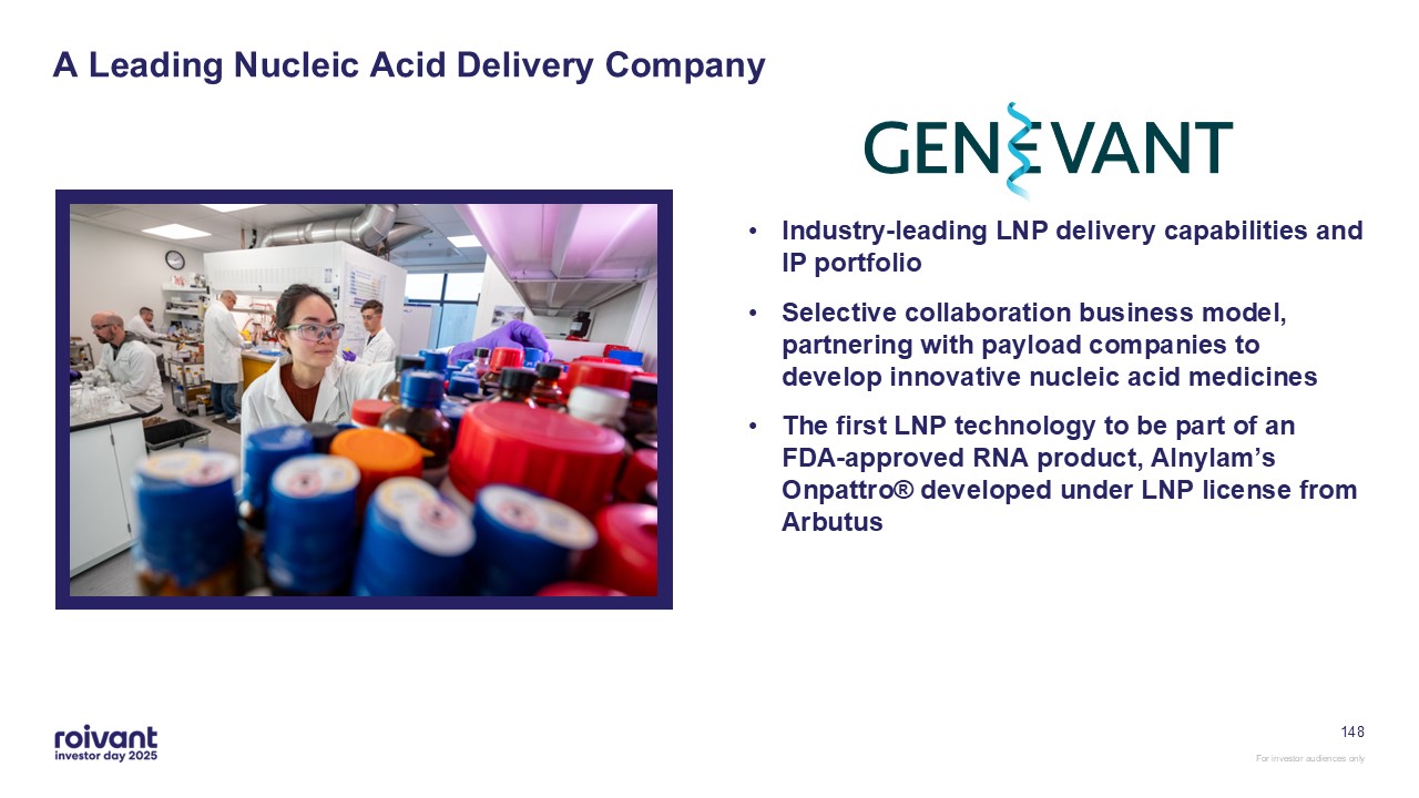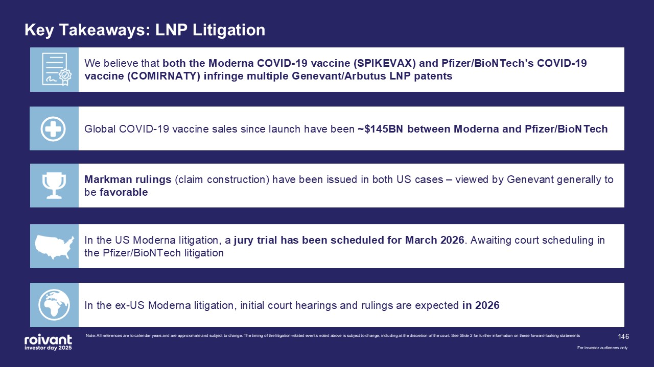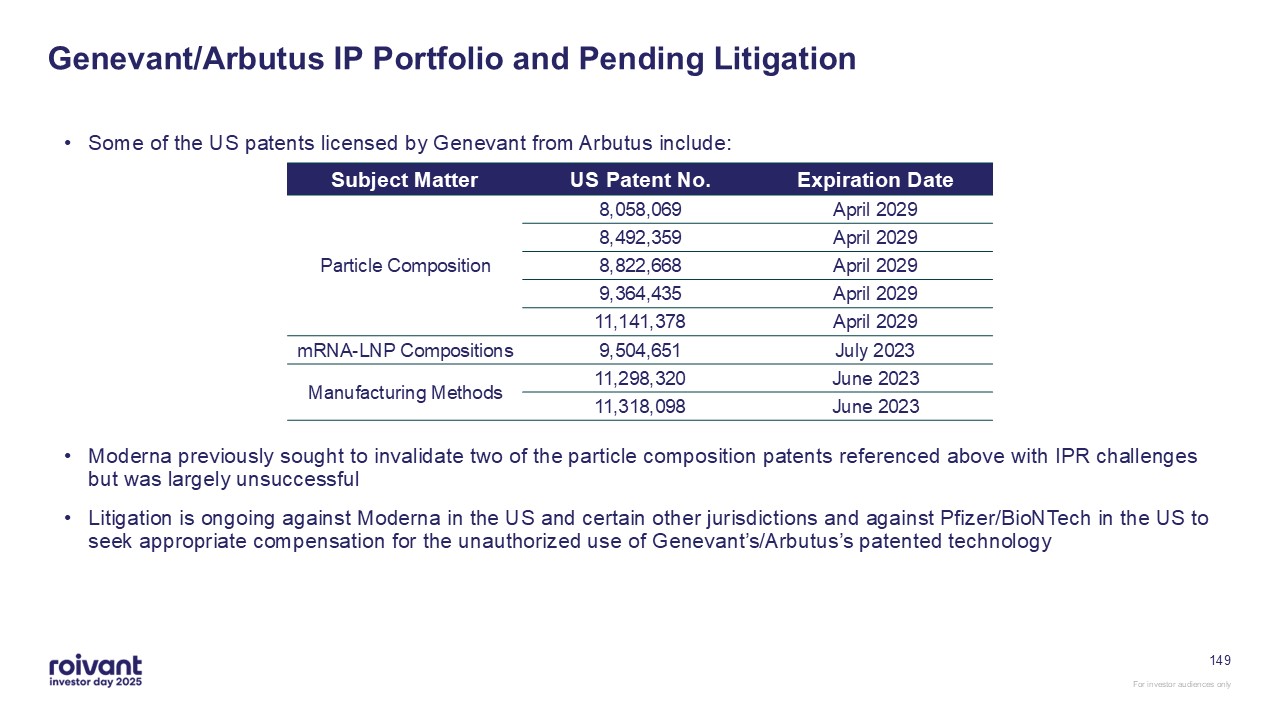 146  We believe that both the Moderna COVID-19 vaccine (SPIKEVAX) and Pfizer/BioNTech’s COVID-19 vaccine (COMIRNATY) infringe multiple Genevant/Arbutus LNP patents  In the ex-US Moderna litigation, initial court hearings and rulings are expected in 2026  Markman rulings (claim construction) have been issued in both US cases – viewed by Genevant generally to be favorable   Global COVID-19 vaccine sales since launch have been ~$145BN between Moderna and Pfizer/BioNTech  In the US Moderna litigation, a jury trial has been scheduled for March 2026. Awaiting court scheduling in the Pfizer/BioNTech litigation  Key Takeaways: LNP Litigation  For investor audiences only  Note: All references are to calendar years and are approximate and subject to change. The timing of the litigation-related events noted above is subject to change, including at the discretion of the court. See Slide 2 for further information on these forward-looking statements