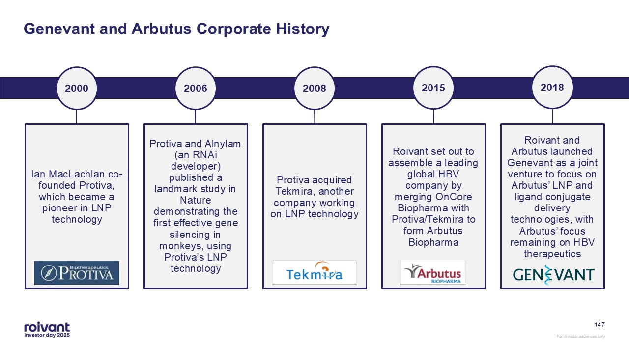 Genevant and Arbutus Corporate History  2006  Protiva acquired Tekmira, another company working on LNP technology  Roivant set out to assemble a leading global HBV company by merging OnCore Biopharma with Protiva/Tekmira to form Arbutus Biopharma  Roivant and Arbutus launched Genevant as a joint venture to focus on Arbutus’ LNP and ligand conjugate delivery technologies, with Arbutus’ focus remaining on HBV therapeutics  2008  2015  2018  Protiva and Alnylam (an RNAi developer) published a landmark study in Nature demonstrating the first effective gene silencing in monkeys, using Protiva’s LNP technology  2000  Ian MacLachlan co-founded Protiva, which became a pioneer in LNP technology  147