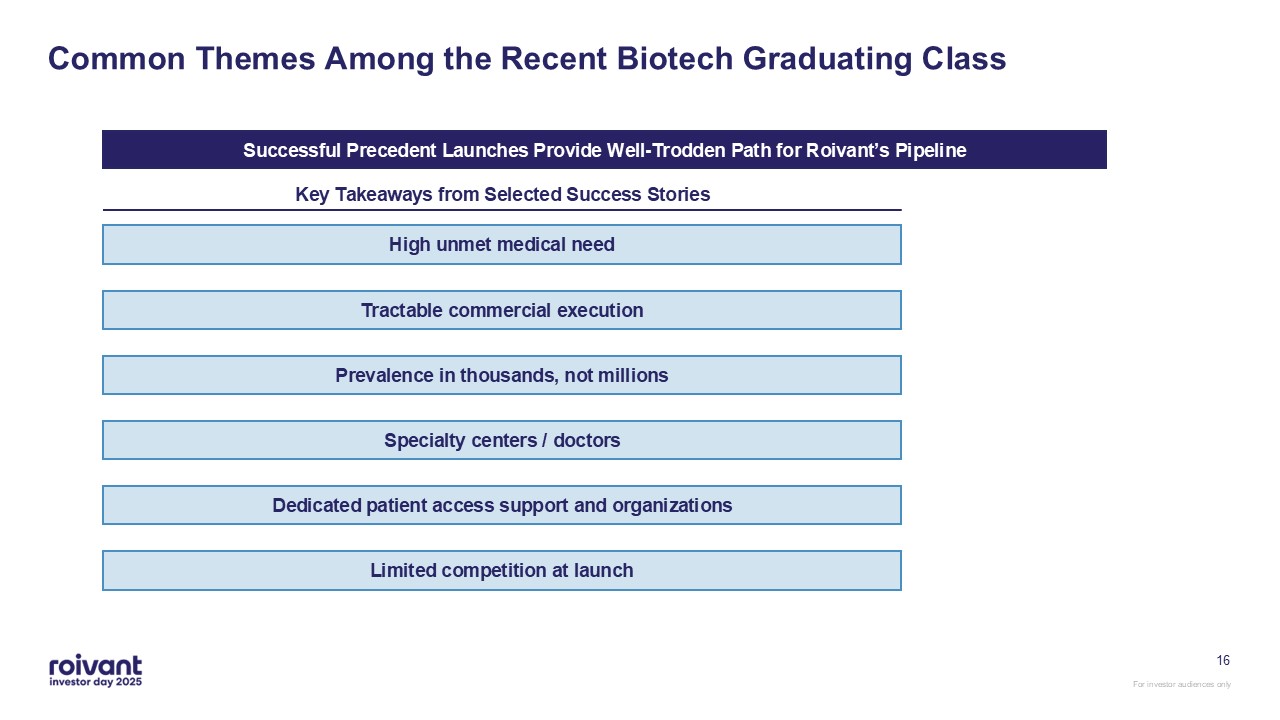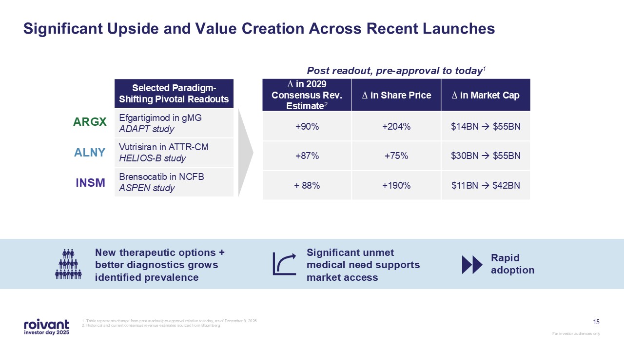 15  Significant Upside and Value Creation Across Recent Launches  1. Table represents change from post readout/pre-approval relative to today, as of December 9, 2025  2. Historical and current consensus revenue estimates sourced from Bloomberg  Selected Paradigm-Shifting Pivotal Readouts  Efgartigimod in gMG   ADAPT study  Vutrisiran in ATTR-CM   HELIOS-B study  Brensocatib in NCFB   ASPEN study  ∆ in 2029 Consensus Rev. Estimate2   ∆ in Share Price  ∆ in Market Cap  +90%  +204%  $14BN  $55BN  +87%  +75%  $30BN  $55BN  + 88%  +190%  $11BN  $42BN  ARGX  ALNY  INSM  Rapid adoption  New therapeutic options + better diagnostics grows identified prevalence  Significant unmet medical need supports market access  Post readout, pre-approval to today1