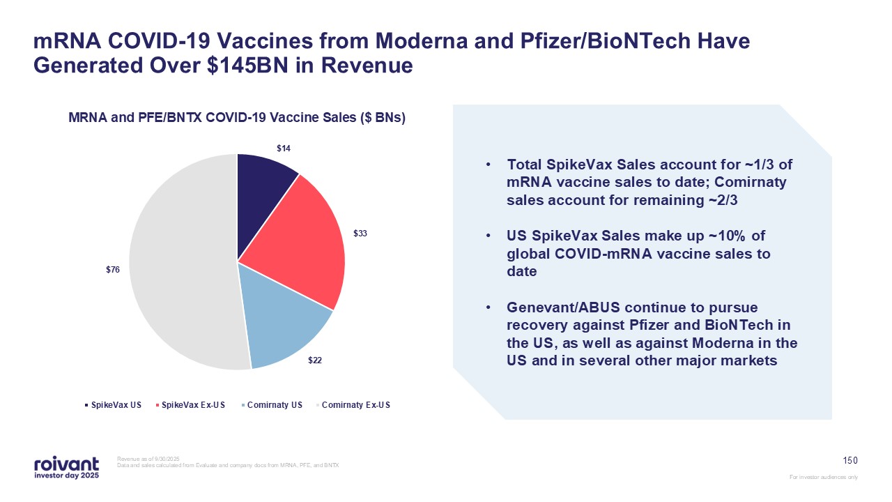 150  mRNA COVID-19 Vaccines from Moderna and Pfizer/BioNTech Have Generated Over $145BN in Revenue  Revenue as of 9/30/2025   Data and sales calculated from Evaluate and company docs from MRNA, PFE, and BNTX  Total SpikeVax Sales account for ~1/3 of mRNA vaccine sales to date; Comirnaty sales account for remaining ~2/3  US SpikeVax Sales make up ~10% of global COVID-mRNA vaccine sales to date  Genevant/ABUS continue to pursue recovery against Pfizer and BioNTech in the US, as well as against Moderna in the US and in several other major markets