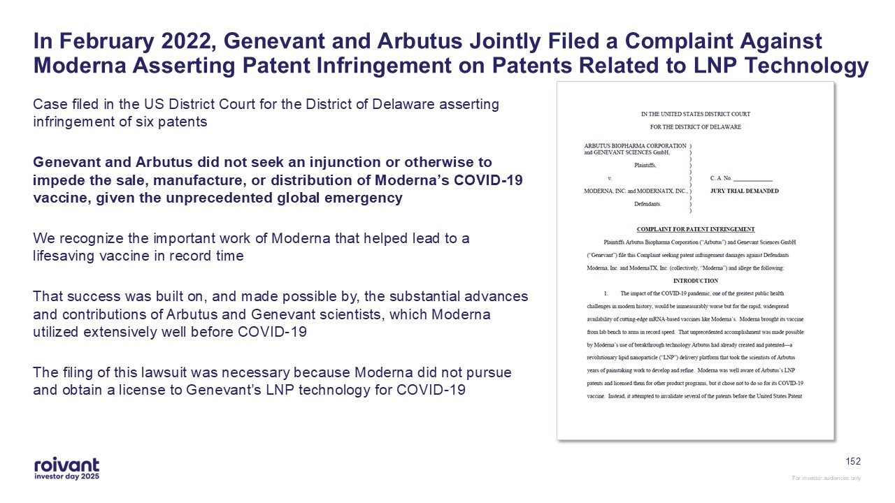 152  In February 2022, Genevant and Arbutus Jointly Filed a Complaint Against Moderna Asserting Patent Infringement on Patents Related to LNP Technology  Case filed in the US District Court for the District of Delaware asserting infringement of six patents  Genevant and Arbutus did not seek an injunction or otherwise to impede the sale, manufacture, or distribution of Moderna’s COVID-19 vaccine, given the unprecedented global emergency  We recognize the important work of Moderna that helped lead to a lifesaving vaccine in record time  That success was built on, and made possible by, the substantial advances and contributions of Arbutus and Genevant scientists, which Moderna utilized extensively well before COVID-19  The filing of this lawsuit was necessary because Moderna did not pursue and obtain a license to Genevant’s LNP technology for COVID-19