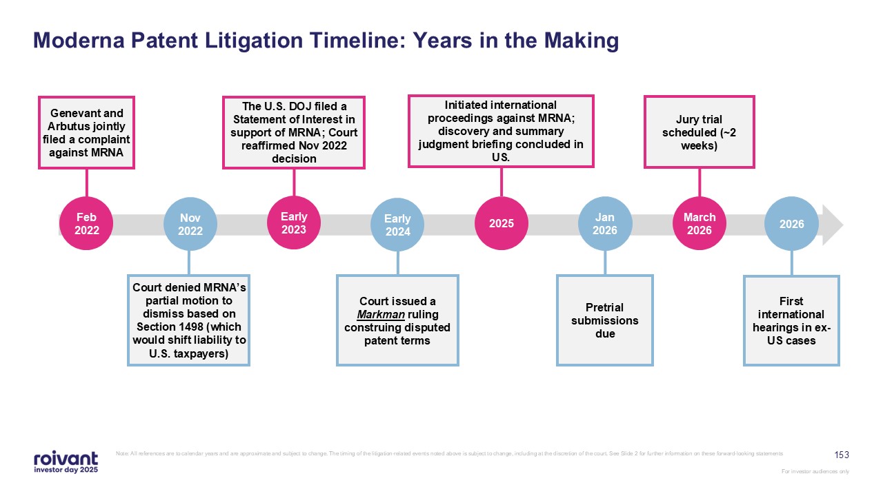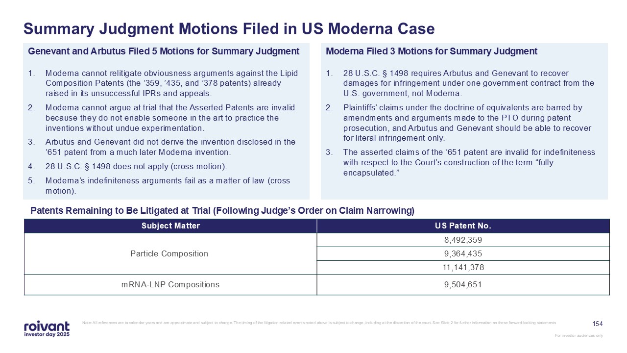 153  Moderna Patent Litigation Timeline: Years in the Making  Note: All references are to calendar years and are approximate and subject to change. The timing of the litigation-related events noted above is subject to change, including at the discretion of the court. See Slide 2 for further information on these forward-looking statements  Early  2023  The U.S. DOJ filed a Statement of Interest in support of MRNA; Court reaffirmed Nov 2022 decision   Feb  2022  Genevant and Arbutus jointly filed a complaint against MRNA  2025  Initiated international proceedings against MRNA; discovery and summary judgment briefing concluded in US.  Jan 2026  Pretrial submissions due  Early 2024  Court issued a Markman ruling construing disputed patent terms  Nov  2022  Court denied MRNA’s partial motion to dismiss based on Section 1498 (which would shift liability to U.S. taxpayers)  March 2026  Jury trial scheduled (~2 weeks)  2026  First international hearings in ex-US cases