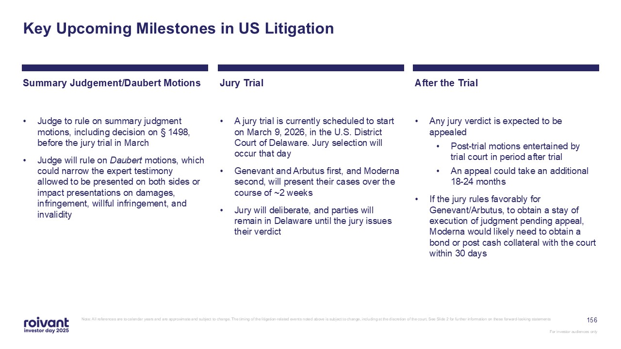 Key Upcoming Milestones in US Litigation  Judge to rule on summary judgment motions, including decision on § 1498, before the jury trial in March  Judge will rule on Daubert motions, which could narrow the expert testimony allowed to be presented on both sides or impact presentations on damages, infringement, willful infringement, and invalidity  A jury trial is currently scheduled to start on March 9, 2026, in the U.S. District Court of Delaware. Jury selection will occur that day  Genevant and Arbutus first, and Moderna second, will present their cases over the course of ~2 weeks  Jury will deliberate, and parties will remain in Delaware until the jury issues their verdict  Jury Trial  Summary Judgement/Daubert Motions  Any jury verdict is expected to be appealed  Post-trial motions entertained by trial court in period after trial   An appeal could take an additional 18-24 months   If the jury rules favorably for Genevant/Arbutus, to obtain a stay of execution of judgment pending appeal, Moderna would likely need to obtain a bond or post cash collateral with the court within 30 days  After the Trial  156  Note: All references are to calendar years and are approximate and subject to change. The timing of the litigation-related events noted above is subject to change, including at the discretion of the court. See Slide 2 for further information on these forward-looking statements