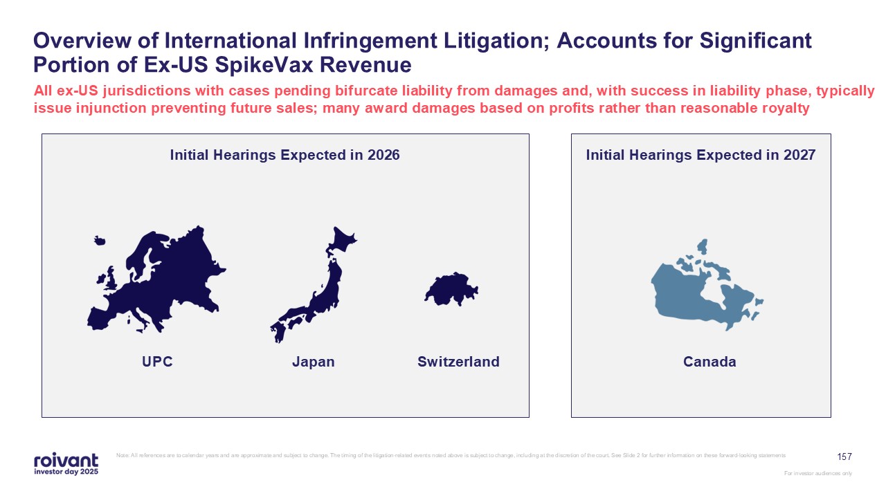 157  Overview of International Infringement Litigation; Accounts for Significant Portion of Ex-US SpikeVax Revenue  All ex-US jurisdictions with cases pending bifurcate liability from damages and, with success in liability phase, typically issue injunction preventing future sales; many award damages based on profits rather than reasonable royalty  Initial Hearings Expected in 2026  Initial Hearings Expected in 2027   UPC  Japan  Switzerland  Canada  Note: All references are to calendar years and are approximate and subject to change. The timing of the litigation-related events noted above is subject to change, including at the discretion of the court. See Slide 2 for further information on these forward-looking statements