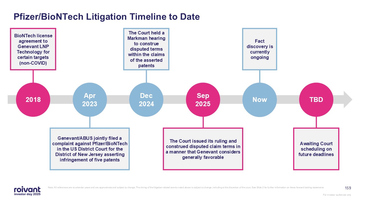 159  Pfizer/BioNTech Litigation Timeline to Date  Note: All references are to calendar years and are approximate and subject to change. The timing of the litigation-related events noted above is subject to change, including at the discretion of the court. See Slide 2 for further information on these forward-looking statements  Awaiting Court scheduling on future deadlines  TBD  The Court held a Markman hearing to construe disputed terms within the claims of the asserted patents  Dec 2024  Now  Fact discovery is currently ongoing  BioNTech license agreement to Genevant LNP Technology for certain targets (non-COVID)  2018  The Court issued its ruling and construed disputed claim terms in a manner that Genevant considers generally favorable  Sep 2025  Genevant/ABUS jointly filed a complaint against Pfizer/BioNTech in the US District Court for the District of New Jersey asserting infringement of five patents  Apr 2023