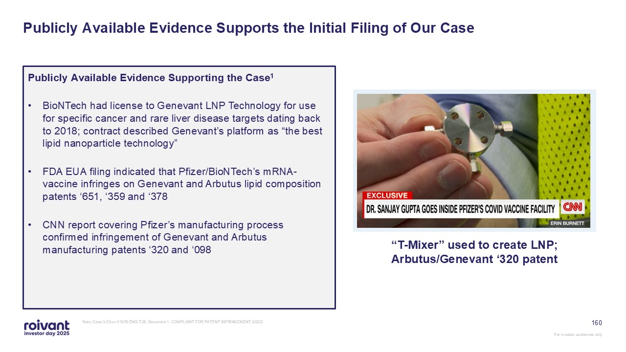 Publicly Available Evidence Supports the Initial Filing of Our Case  Publicly Available Evidence Supporting the Case1  BioNTech had license to Genevant LNP Technology for use for specific cancer and rare liver disease targets dating back to 2018; contract described Genevant’s platform as “the best lipid nanoparticle technology”  FDA EUA filing indicated that Pfizer/BioNTech’s mRNA-vaccine infringes on Genevant and Arbutus lipid composition patents ‘651, ‘359 and ‘378  CNN report covering Pfizer’s manufacturing process confirmed infringement of Genevant and Arbutus manufacturing patents ‘320 and ‘098  160  “T-Mixer” used to create LNP; Arbutus/Genevant ‘320 patent  Note: Case 3:23-cv-01876-ZNQ-TJB, Document 1; COMPLAINT FOR PATENT INFRINGEMENT (2022)