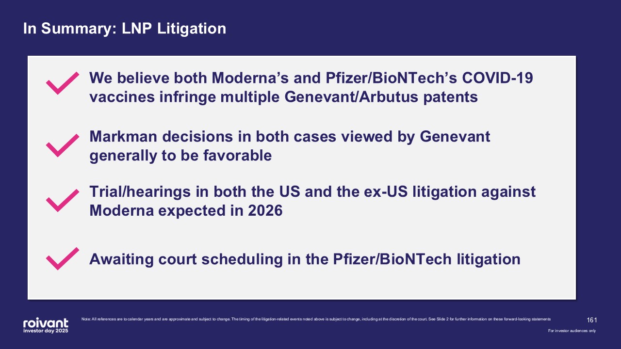 161  In Summary: LNP Litigation  We believe both Moderna’s and Pfizer/BioNTech’s COVID-19 vaccines infringe multiple Genevant/Arbutus patents  Trial/hearings in both the US and the ex-US litigation against Moderna expected in 2026  Awaiting court scheduling in the Pfizer/BioNTech litigation  Markman decisions in both cases viewed by Genevant generally to be favorable  For investor audiences only  Note: All references are to calendar years and are approximate and subject to change. The timing of the litigation-related events noted above is subject to change, including at the discretion of the court. See Slide 2 for further information on these forward-looking statements
