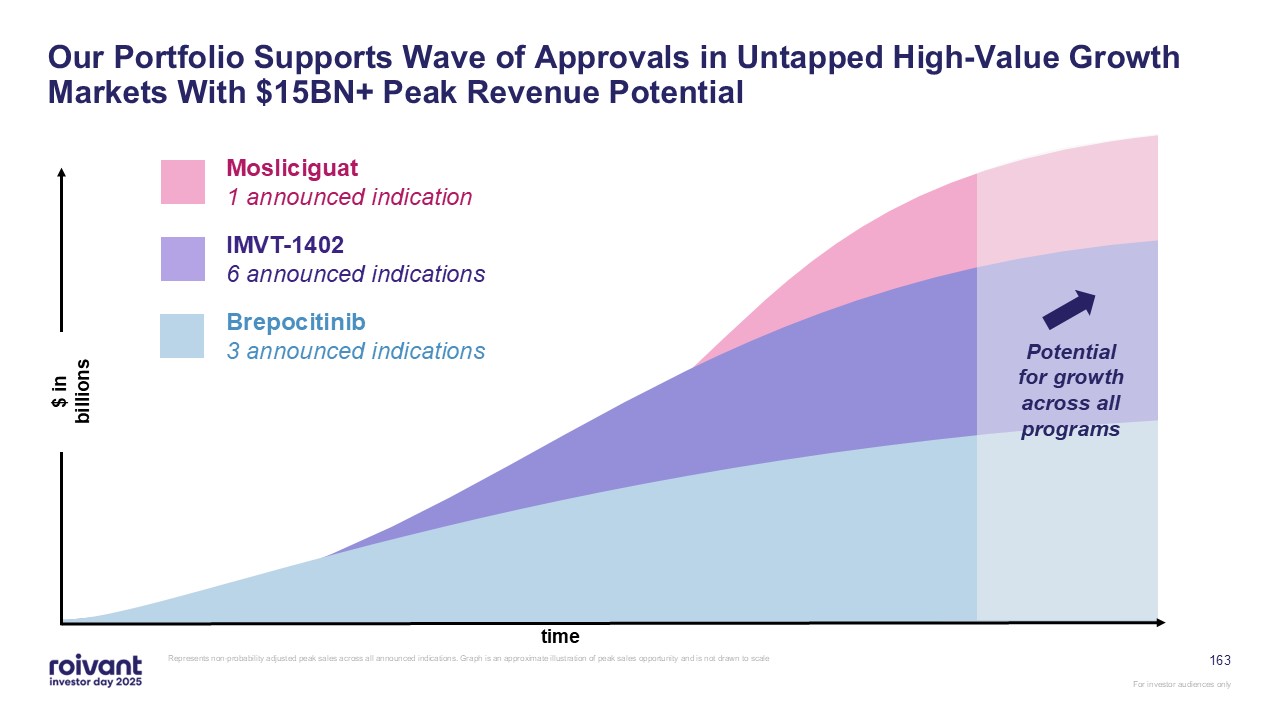 163  Our Portfolio Supports Wave of Approvals in Untapped High-Value Growth Markets With $15BN+ Peak Revenue Potential  Represents non-probability adjusted peak sales across all announced indications. Graph is an approximate illustration of peak sales opportunity and is not drawn to scale   time  $ in billions  Potential for growth across all programs  Mosliciguat  1 announced indication  IMVT-1402  6 announced indications  Brepocitinib  3 announced indications