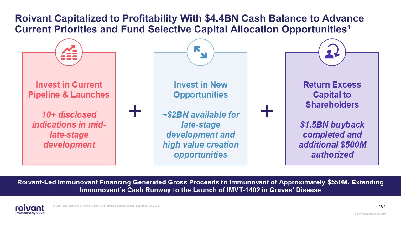 164  Roivant Capitalized to Profitability With $4.4BN Cash Balance to Advance Current Priorities and Fund Selective Capital Allocation Opportunities1  1. Cash, cash equivalents, restricted cash, and marketable securities as of September 30, 2025  Invest in Current Pipeline & Launches  10+ disclosed indications in mid-late-stage development  Invest in New Opportunities  ~$2BN available for late-stage development and high value creation opportunities  Return Excess Capital to Shareholders  $1.5BN buyback completed and additional $500M authorized  +  +  Roivant-Led Immunovant Financing Generated Gross Proceeds to Immunovant of Approximately $550M, Extending Immunovant’s Cash Runway to the Launch of IMVT-1402 in Graves’ Disease