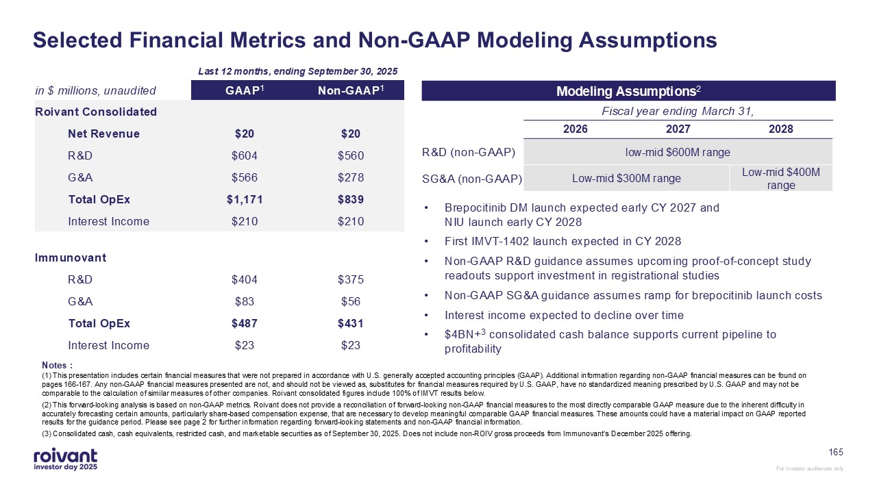 Modeling Assumptions2  in $ millions, unaudited  GAAP1  Non-GAAP1  Roivant Consolidated  Net Revenue  $20  $20  R&D   $604  $560  G&A   $566  $278  Total OpEx   $1,171  $839  Interest Income  $210  $210  Immunovant  R&D   $404  $375  G&A   $83  $56  Total OpEx   $487  $431  Interest Income  $23  $23  165  Selected Financial Metrics and Non-GAAP Modeling Assumptions  Last 12 months, ending September 30, 2025  2026  2027  2028  low-mid $600M range   Low-mid $300M range   Low-mid $400M range  Fiscal year ending March 31,  Brepocitinib DM launch expected early CY 2027 and NIU launch early CY 2028  First IMVT-1402 launch expected in CY 2028  Non-GAAP R&D guidance assumes upcoming proof-of-concept study readouts support investment in registrational studies  Non-GAAP SG&A guidance assumes ramp for brepocitinib launch costs  Interest income expected to decline over time  $4BN+3 consolidated cash balance supports current pipeline to profitability   R&D (non-GAAP)  SG&A (non-GAAP)  (1) This presentation includes certain financial measures that were not prepared in accordance with U.S. generally accepted accounting principles (GAAP). Additional information regarding non-GAAP financial measures can be found on pages 166-167. Any non-GAAP financial measures presented are not, and should not be viewed as, substitutes for financial measures required by U.S. GAAP, have no standardized meaning prescribed by U.S. GAAP and may not be comparable to the calculation of similar measures of other companies. Roivant consolidated figures include 100% of IMVT results below.   (2) This forward-looking analysis is based on non-GAAP metrics. Roivant does not provide a reconciliation of forward-looking non-GAAP financial measures to the most directly comparable GAAP measure due to the inherent difficulty in accurately forecasting certain amounts, particularly share-based compensation expense, that are necessary to develop meaningful comparable GAAP financial measures. These amounts could have a material impact on GAAP reported results for the guidance period. Please see page 2 for further information regarding forward-looking statements and non-GAAP financial information.   (3) Consolidated cash, cash equivalents, restricted cash, and marketable securities as of September 30, 2025. Does not include non-ROIV gross proceeds from Immunovant’s December 2025 offering.   Notes :