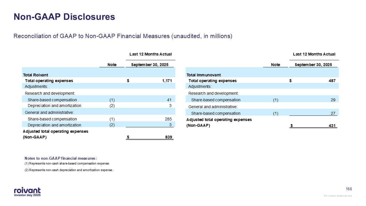 Non-GAAP Disclosures  (1) Represents non-cash share-based compensation expense.  (2) Represents non-cash depreciation and amortization expense.  Notes to non-GAAP financial measures:   Reconciliation of GAAP to Non-GAAP Financial Measures (unaudited, in millions)  166           Last 12 Months Actual     Note     September 30, 2025     Total Roivant              Total operating expenses         $ 1,171     Adjustments:              Research and development:        Share-based compensation  (1)      41      Depreciation and amortization  (2)      3      General and administrative:        Share-based compensation  (1)      285      Depreciation and amortization  (2)      3      Adjusted total operating expenses   (Non-GAAP)   $ 839               Last 12 Months Actual     Note     September 30, 2025     Total Immunovant           Total operating expenses        $ 487      Adjustments:              Research and development:        Share-based compensation  (1)      29      General and administrative:        Share-based compensation  (1)      27      Adjusted total operating expenses   (Non-GAAP)   $ 431