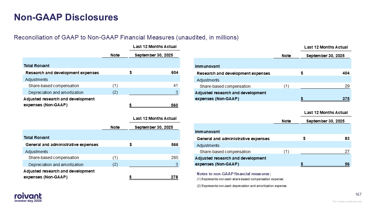 167  Non-GAAP Disclosures  Reconciliation of GAAP to Non-GAAP Financial Measures (unaudited, in millions)           Last 12 Months Actual     Note     September 30, 2025     Total Roivant           Research and development expenses     $ 604      Adjustments        Share-based compensation  (1)     41     Depreciation and amortization  (2)     3     Adjusted research and development expenses (Non-GAAP)  $ 560              Last 12 Months Actual     Note     September 30, 2025     Immunovant           Research and development expenses     $ 404      Adjustments        Share-based compensation  (1)     29     Adjusted research and development expenses (Non-GAAP)  $ 375              Last 12 Months Actual     Note     September 30, 2025     Total Roivant           General and administrative expenses     $ 566      Adjustments        Share-based compensation  (1)     285     Depreciation and amortization  (2)     3     Adjusted research and development expenses (Non-GAAP)  $ 278              Last 12 Months Actual     Note     September 30, 2025     Immunovant           General and administrative expenses     $ 83      Adjustments        Share-based compensation  (1)     27     Adjusted research and development expenses (Non-GAAP)  $ 56     (1) Represents non-cash share-based compensation expense.  (2) Represents non-cash depreciation and amortization expense.  Notes to non-GAAP financial measures: