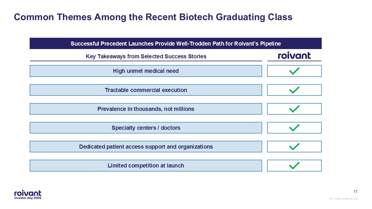 16  Common Themes Among the Recent Biotech Graduating Class  Key Takeaways from Selected Success Stories  High unmet medical need  Limited competition at launch  Dedicated patient access support and organizations  Specialty centers / doctors  Prevalence in thousands, not millions  Tractable commercial execution  Successful Precedent Launches Provide Well-Trodden Path for Roivant’s Pipeline