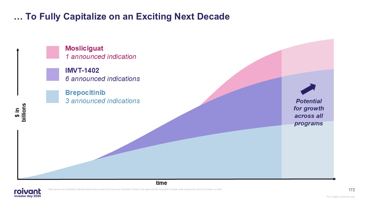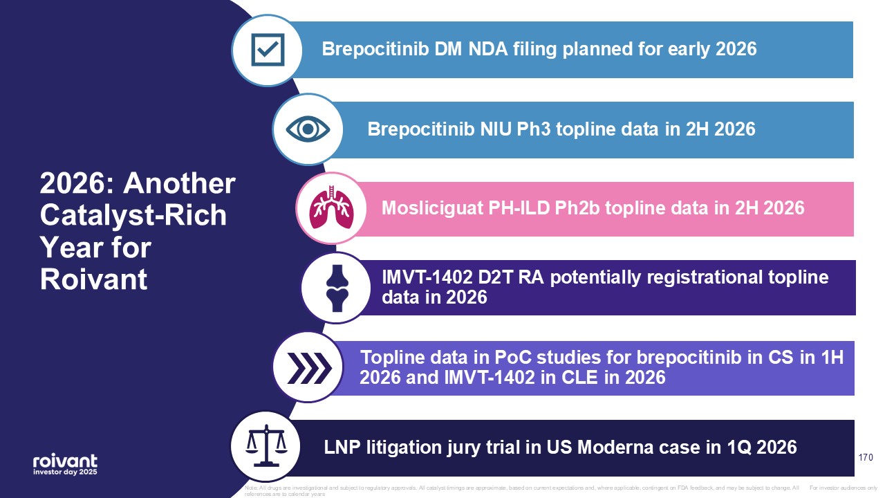 2026: Another Catalyst-Rich Year for Roivant  For investor audiences only  LNP litigation jury trial in US Moderna case in 1Q 2026  Mosliciguat PH-ILD Ph2b topline data in 2H 2026  Brepocitinib NIU Ph3 topline data in 2H 2026  Brepocitinib DM NDA filing planned for early 2026  Topline data in PoC studies for brepocitinib in CS in 1H 2026 and IMVT-1402 in CLE in 2026  IMVT-1402 D2T RA potentially registrational topline data in 2026  Note: All drugs are investigational and subject to regulatory approvals. All catalyst timings are approximate, based on current expectations and, where applicable, contingent on FDA feedback, and may be subject to change. All references are to calendar years  170