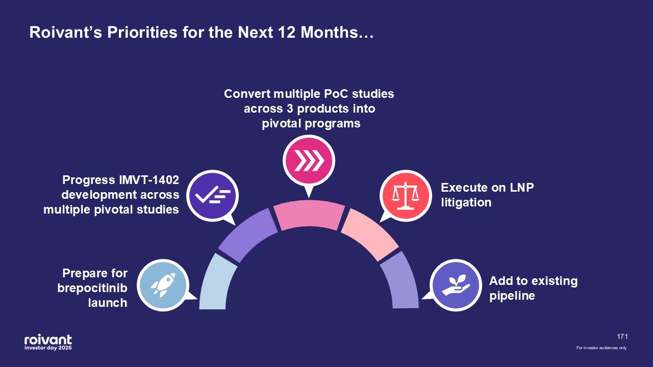 171  Roivant’s Priorities for the Next 12 Months…   Prepare for brepocitinib launch  Progress IMVT-1402 development across multiple pivotal studies  Convert multiple PoC studies across 3 products into pivotal programs  Execute on LNP litigation  Add to existing pipeline  For investor audiences only