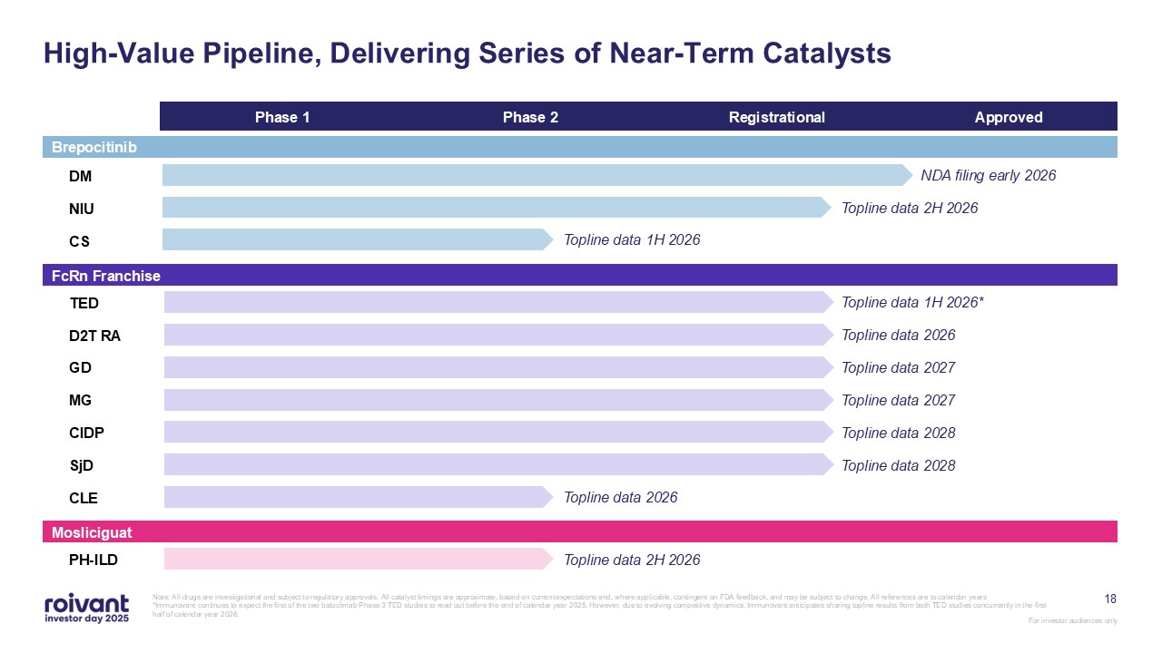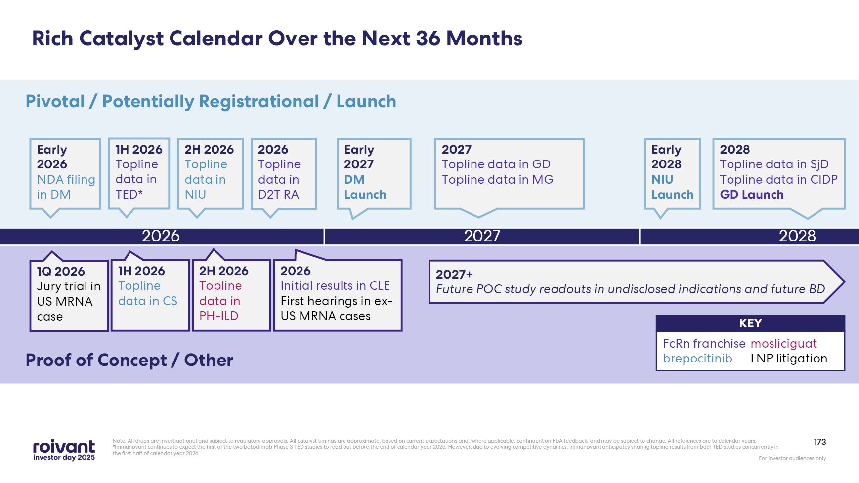 Rich Catalyst Calendar Over the Next 36 Months  Note: All drugs are investigational and subject to regulatory approvals. All catalyst timings are approximate, based on current expectations and, where applicable, contingent on FDA feedback, and may be subject to change. All references are to calendar years.*Immunovant continues to expect the first of the two batoclimab Phase 3 TED studies to read out before the end of calendar year 2025. However, due to evolving competitive dynamics, Immunovant anticipates sharing topline results from both TED studies concurrently in the first half of calendar year 2026  2026  Pivotal / Potentially Registrational / Launch  Proof of Concept / Other  1H 2026  Topline data in TED*  2027  2028  2H 2026  Topline data in PH-ILD  1Q 2026  Jury trial in US MRNA case  2026  Topline data in D2T RA  2026  Initial results in CLE  First hearings in ex-US MRNA cases  2H 2026  Topline data in NIU  2027  Topline data in GD  Topline data in MG  2028  Topline data in SjD  Topline data in CIDP  GD Launch  FcRn franchise  brepocitinib  mosliciguat  LNP litigation  KEY  1H 2026  Topline data in CS  Early 2028  NIU Launch  Early 2027  DM Launch  2027+  Future POC study readouts in undisclosed indications and future BD   173  Early 2026  NDA filing in DM