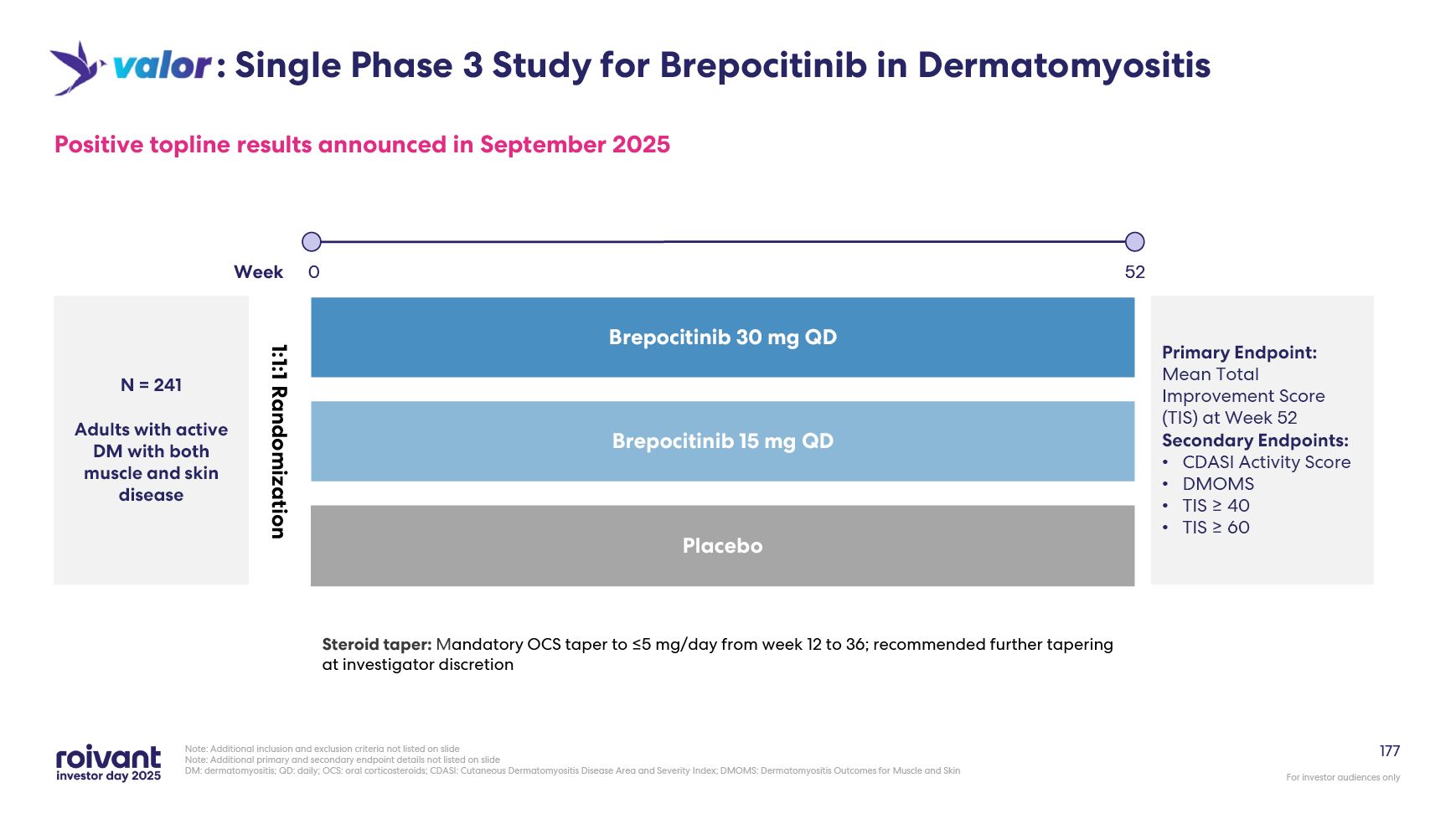 177  Positive topline results announced in September 2025  Note: Additional inclusion and exclusion criteria not listed on slide  Note: Additional primary and secondary endpoint details not listed on slide  DM: dermatomyositis; QD: daily; OCS: oral corticosteroids; CDASI: Cutaneous Dermatomyositis Disease Area and Severity Index; DMOMS: Dermatomyositis Outcomes for Muscle and Skin  N = 241  Adults with active DM with both muscle and skin disease  1:1:1 Randomization  Placebo  Brepocitinib 30 mg QD  Brepocitinib 15 mg QD   : Single Phase 3 Study for Brepocitinib in Dermatomyositis   Primary Endpoint:   Mean Total Improvement Score (TIS) at Week 52  Secondary Endpoints:   CDASI Activity Score  DMOMS  TIS ≥ 40  TIS ≥ 60  52  Week  0  Steroid taper: Mandatory OCS taper to ≤5 mg/day from week 12 to 36; recommended further tapering at investigator discretion