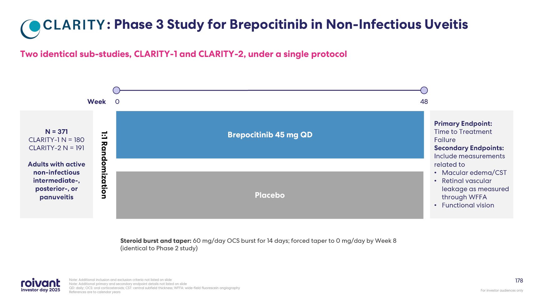 178   : : Phase 3 Study for Brepocitinib in Non-Infectious Uveitis   Two identical sub-studies, CLARITY-1 and CLARITY-2, under a single protocol  Note: Additional inclusion and exclusion criteria not listed on slide  Note: Additional primary and secondary endpoint details not listed on slide  QD: daily; OCS: oral corticosteroids; CST: central subfield thickness; WFFA: wide-field fluorescein angiography  References are to calendar years  N = 371  CLARITY-1 N = 180  CLARITY-2 N = 191  Adults with active non-infectious intermediate-, posterior-, or panuveitis  Placebo  Brepocitinib 45 mg QD  Primary Endpoint:   Time to Treatment Failure   Secondary Endpoints: Include measurements related to   Macular edema/CST  Retinal vascular leakage as measured through WFFA  Functional vision  1:1 Randomization  48  Week  0  Steroid burst and taper: 60 mg/day OCS burst for 14 days; forced taper to 0 mg/day by Week 8 (identical to Phase 2 study)