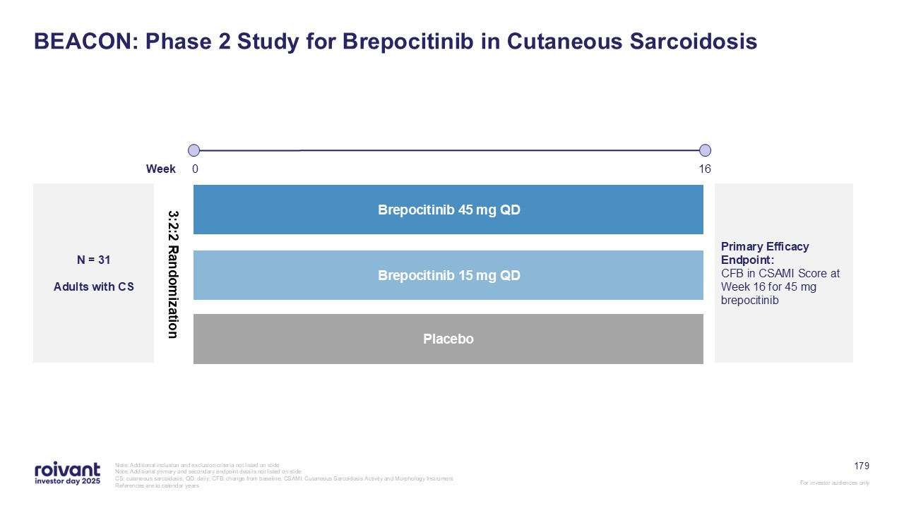 179  BEACON: Phase 2 Study for Brepocitinib in Cutaneous Sarcoidosis  Note: Additional inclusion and exclusion criteria not listed on slide  Note: Additional primary and secondary endpoint details not listed on slide  CS: cutaneous sarcoidosis; QD: daily; CFB: change from baseline; CSAMI: Cutaneous Sarcoidosis Activity and Morphology Instrument   References are to calendar years  N = 31  Adults with CS  Placebo  Brepocitinib 45 mg QD  Brepocitinib 15 mg QD  Primary Efficacy Endpoint:   CFB in CSAMI Score at Week 16 for 45 mg brepocitinib  3:2:2 Randomization  16  Week  0