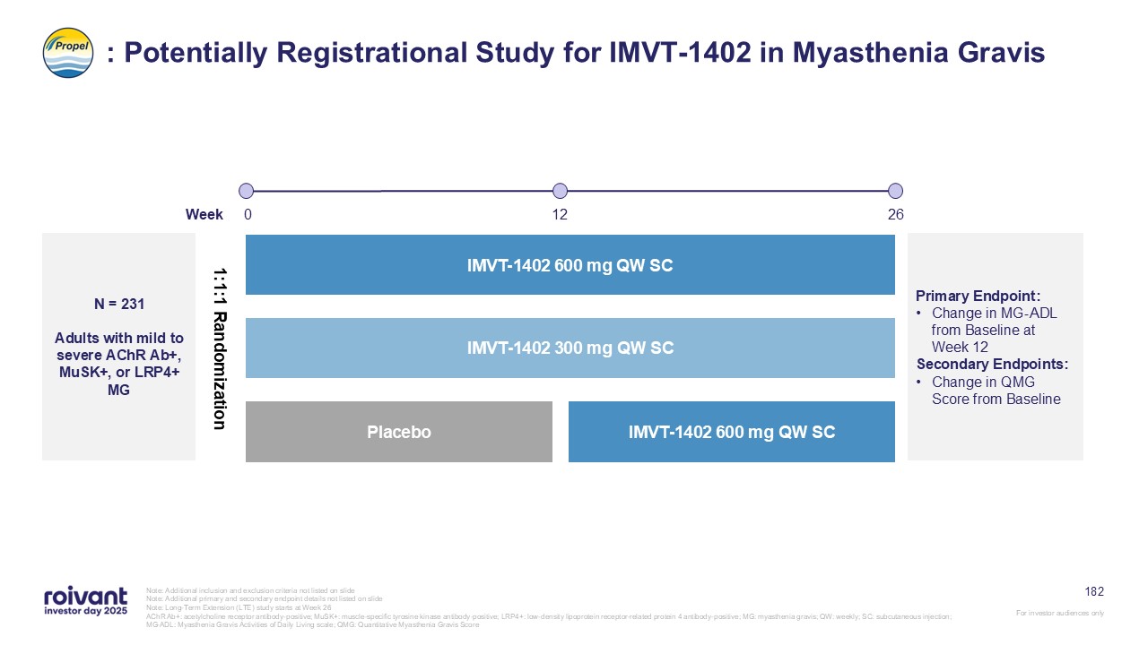 182   : Potentially Registrational Study for IMVT-1402 in Myasthenia Gravis   Note: Additional inclusion and exclusion criteria not listed on slide  Note: Additional primary and secondary endpoint details not listed on slide  Note: Long-Term Extension (LTE) study starts at Week 26  AChR Ab+: acetylcholine receptor antibody-positive; MuSK+: muscle-specific tyrosine kinase antibody-positive; LRP4+: low-density lipoprotein receptor-related protein 4 antibody-positive; MG: myasthenia gravis; QW: weekly; SC: subcutaneous injection; MG-ADL: Myasthenia Gravis Activities of Daily Living scale; QMG: Quantitative Myasthenia Gravis Score  N = 231  Adults with mild to severe AChR Ab+, MuSK+, or LRP4+ MG   12  26  IMVT-1402 600 mg QW SC  Placebo  IMVT-1402 600 mg QW SC  IMVT-1402 300 mg QW SC  Week  0  Primary Endpoint:   Change in MG-ADL from Baseline at Week 12  Secondary Endpoints:  Change in QMG Score from Baseline  1:1:1 Randomization
