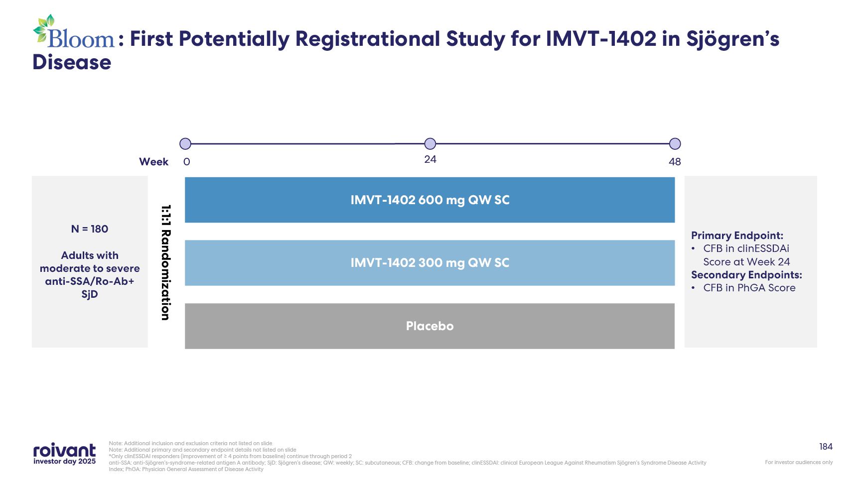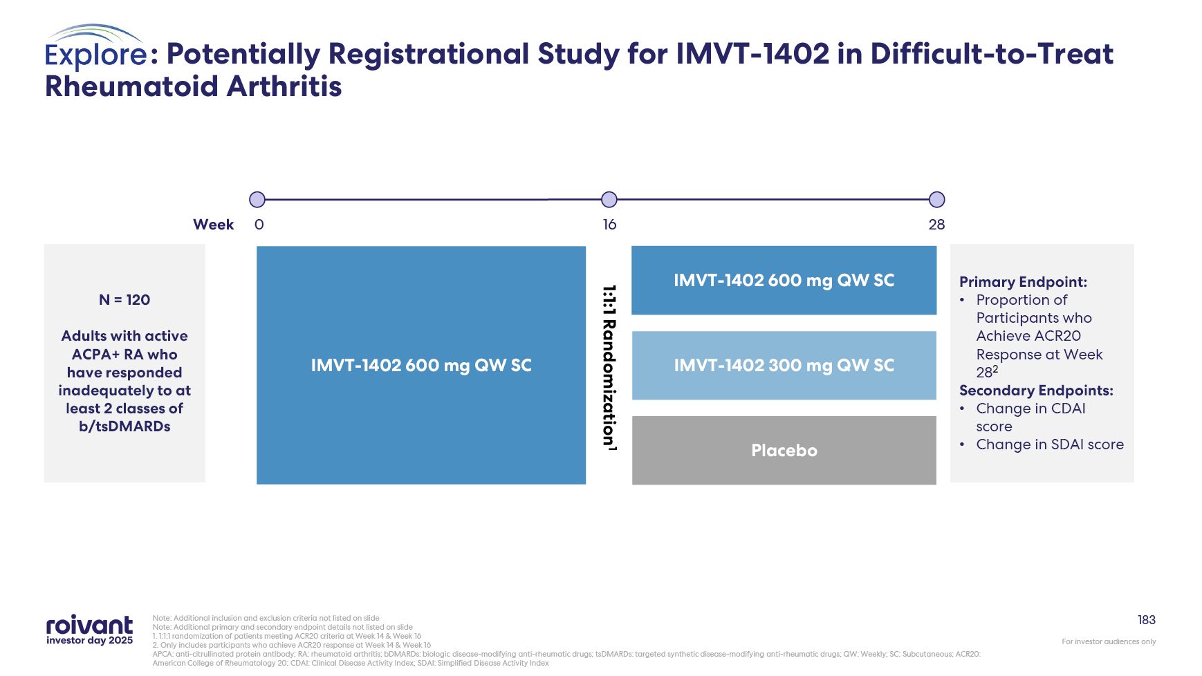 183   : Potentially Registrational Study for IMVT-1402 in Difficult-to-Treat Rheumatoid Arthritis  Note: Additional inclusion and exclusion criteria not listed on slide  Note: Additional primary and secondary endpoint details not listed on slide  1. 1:1:1 randomization of patients meeting ACR20 criteria at Week 14 & Week 16  2. Only includes participants who achieve ACR20 response at Week 14 & Week 16  APCA: anti-citrullinated protein antibody; RA: rheumatoid arthritis; bDMARDs: biologic disease-modifying anti-rheumatic drugs; tsDMARDs: targeted synthetic disease-modifying anti-rheumatic drugs; QW: Weekly; SC: Subcutaneous; ACR20: American College of Rheumatology 20; CDAI: Clinical Disease Activity Index; SDAI: Simplified Disease Activity Index  N = 120  Adults with active ACPA+ RA who have responded inadequately to at least 2 classes of b/tsDMARDs  1:1:1 Randomization1  16  28  IMVT-1402 600 mg QW SC  IMVT-1402 300 mg QW SC  Placebo  IMVT-1402 600 mg QW SC  Week  0  Primary Endpoint:   Proportion of Participants who Achieve ACR20 Response at Week 282   Secondary Endpoints:  Change in CDAI score  Change in SDAI score