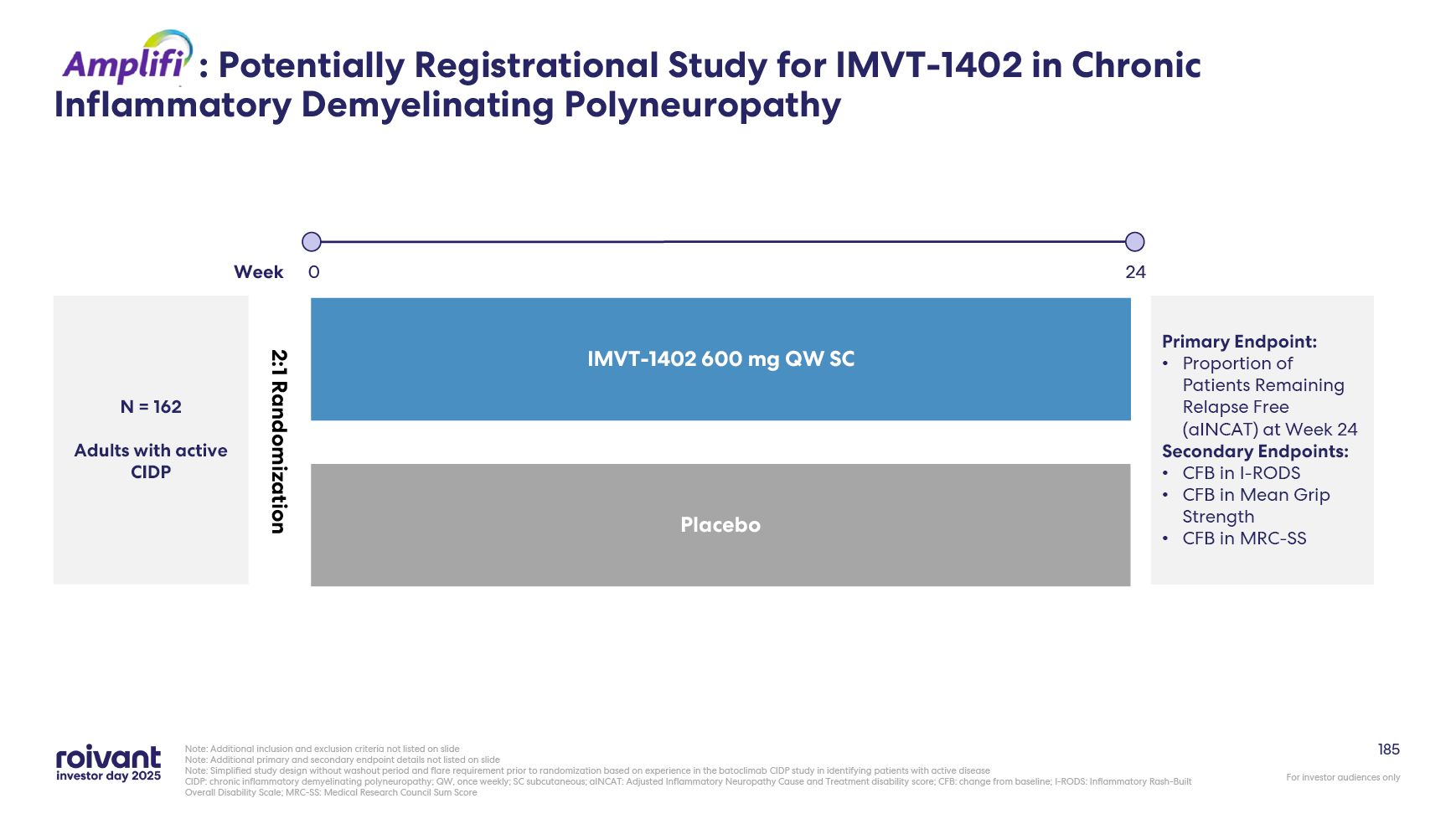 185  Note: Additional inclusion and exclusion criteria not listed on slide  Note: Additional primary and secondary endpoint details not listed on slide  Note: Simplified study design without washout period and flare requirement prior to randomization based on experience in the batoclimab CIDP study in identifying patients with active disease  CIDP: chronic inflammatory demyelinating polyneuropathy; QW, once weekly; SC subcutaneous; aINCAT: Adjusted Inflammatory Neuropathy Cause and Treatment disability score; CFB: change from baseline; I-RODS: Inflammatory Rash-Built Overall Disability Scale; MRC-SS: Medical Research Council Sum Score  N = 162  Adults with active CIDP  Placebo  IMVT-1402 600 mg Qw SC  24  Week  0  Primary Endpoint:   Proportion of Patients Remaining Relapse Free (aINCAT) at Week 24  Secondary Endpoints:  CFB in I-RODS  CFB in Mean Grip Strength  CFB in MRC-SS  2:1 Randomization   : Potentially Registrational Study for IMVT-1402 in Chronic Inflammatory Demyelinating Polyneuropathy