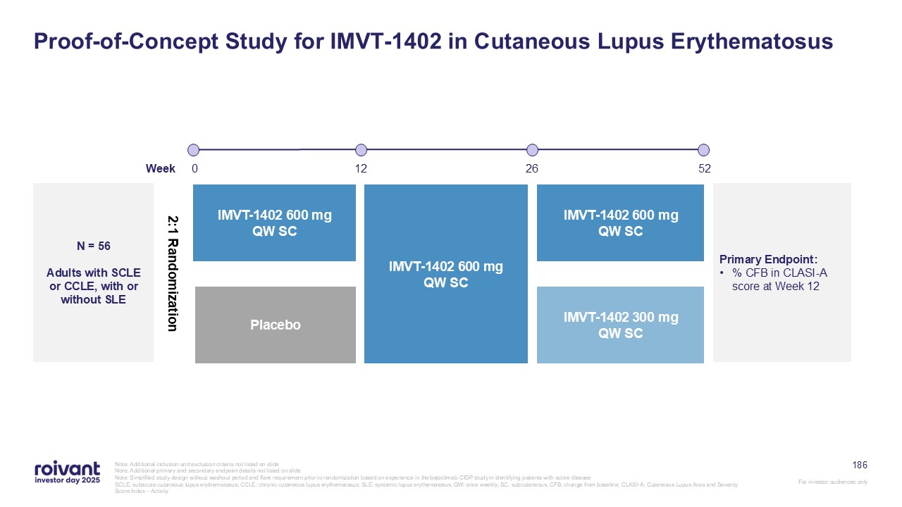 186  Proof-of-Concept Study for IMVT-1402 in Cutaneous Lupus Erythematosus  Note: Additional inclusion and exclusion criteria not listed on slide  Note: Additional primary and secondary endpoint details not listed on slide  Note: Simplified study design without washout period and flare requirement prior to randomization based on experience in the batoclimab CIDP study in identifying patients with active disease  SCLE: subacute cutaneous lupus erythematosus; CCLE: chronic cutaneous lupus erythematosus; SLE: systemic lupus erythematosus; QW: once weekly; SC: subcutaneous; CFB: change from baseline; CLASI-A: Cutaneous Lupus Area and Severity Score Index – Activity  N = 56  Adults with SCLE or CCLE, with or without SLE  52  12  26  Placebo  IMVT-1402 600 mg Qw SC  IMVT-1402 600 mg  QW SC  IMVT-1402 600 mg Qw SC  IMVT-1402 300 mg Qw SC  Week  0  Primary Endpoint:   % CFB in CLASI-A score at Week 12  2:1 Randomization