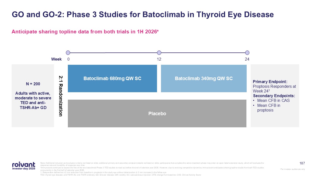 187  GO and GO-2: Phase 3 Studies for Batoclimab in Thyroid Eye Disease  Anticipate sharing topline data from both trials in 1H 2026*  Note: Additional inclusion and exclusion criteria not listed on slide; additional primary and secondary endpoint details not listed on slide; participants that complete the active treatment phase may enter an open-label extension study, which will evaluate the response rate and durability of response over time  *Immunovant continues to expect the first of the two batoclimab Phase 3 TED studies to read out before the end of calendar year 2025. However, due to evolving competitive dynamics, Immunovant anticipates sharing topline results from both TED studies concurrently in the first half of calendar year 2026.  1. Responders defined as ≥ 2 mm reduction from baseline in proptosis in the study eye without deterioration (≥ 2 mm increase) in the fellow eye  TED: thyroid eye disease; anti-TSHR-Ab: anti-TSHR antibody; GD: Graves’ disease; QW: weekly; SC: subcutaneous injection; CFB: change from baseline; CAS: Clinical Activity Score  N = 200  Adults with active, moderate to severe TED and anti-TSHR-Ab+ GD  Batoclimab 680mg QW SC  Batoclimab 340mg QW SC  Placebo  Primary Endpoint:   Proptosis Responders at Week 241  Secondary Endpoints:  Mean CFB in CAS  Mean CFB in proptosis  2:1 Randomization  24  12  Week  0