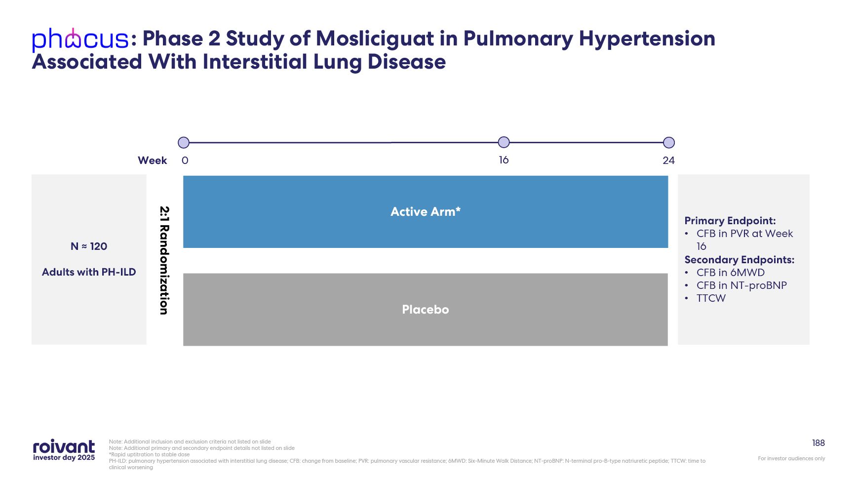 188   : Phase 2 Study of Mosliciguat in Pulmonary Hypertension Associated With Interstitial Lung Disease  Note: Additional inclusion and exclusion criteria not listed on slide  Note: Additional primary and secondary endpoint details not listed on slide  *Rapid uptitration to stable dose  PH-ILD: pulmonary hypertension associated with interstitial lung disease; CFB: change from baseline; PVR: pulmonary vascular resistance; 6MWD: Six-Minute Walk Distance; NT-proBNP: N-terminal pro-B-type natriuretic peptide; TTCW: time to clinical worsening  N ≈ 120  Adults with PH-ILD  Active Arm*  Placebo  Week  24  0  Primary Endpoint:   CFB in PVR at Week 16  Secondary Endpoints:   CFB in 6MWD   CFB in NT-proBNP  TTCW  2:1 Randomization  16