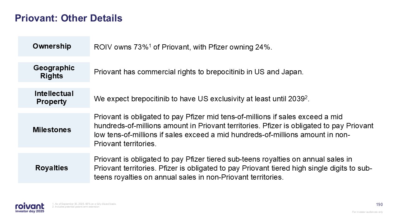190  Priovant: Other Details  ROIV owns 73%1 of Priovant, with Pfizer owning 24%.   Ownership    Geographic   Rights    Intellectual Property    Milestones    Royalties    1. As of September 30, 2025. 65% on a fully diluted basis.  2. Includes potential patent term extension  We expect brepocitinib to have US exclusivity at least until 20392.    Priovant has commercial rights to brepocitinib in US and Japan.   Priovant is obligated to pay Pfizer mid tens-of-millions if sales exceed a mid hundreds-of-millions amount in Priovant territories. Pfizer is obligated to pay Priovant low tens-of-millions if sales exceed a mid hundreds-of-millions amount in non-Priovant territories.    Priovant is obligated to pay Pfizer tiered sub-teens royalties on annual sales in Priovant territories. Pfizer is obligated to pay Priovant tiered high single digits to sub-teens royalties on annual sales in non-Priovant territories.