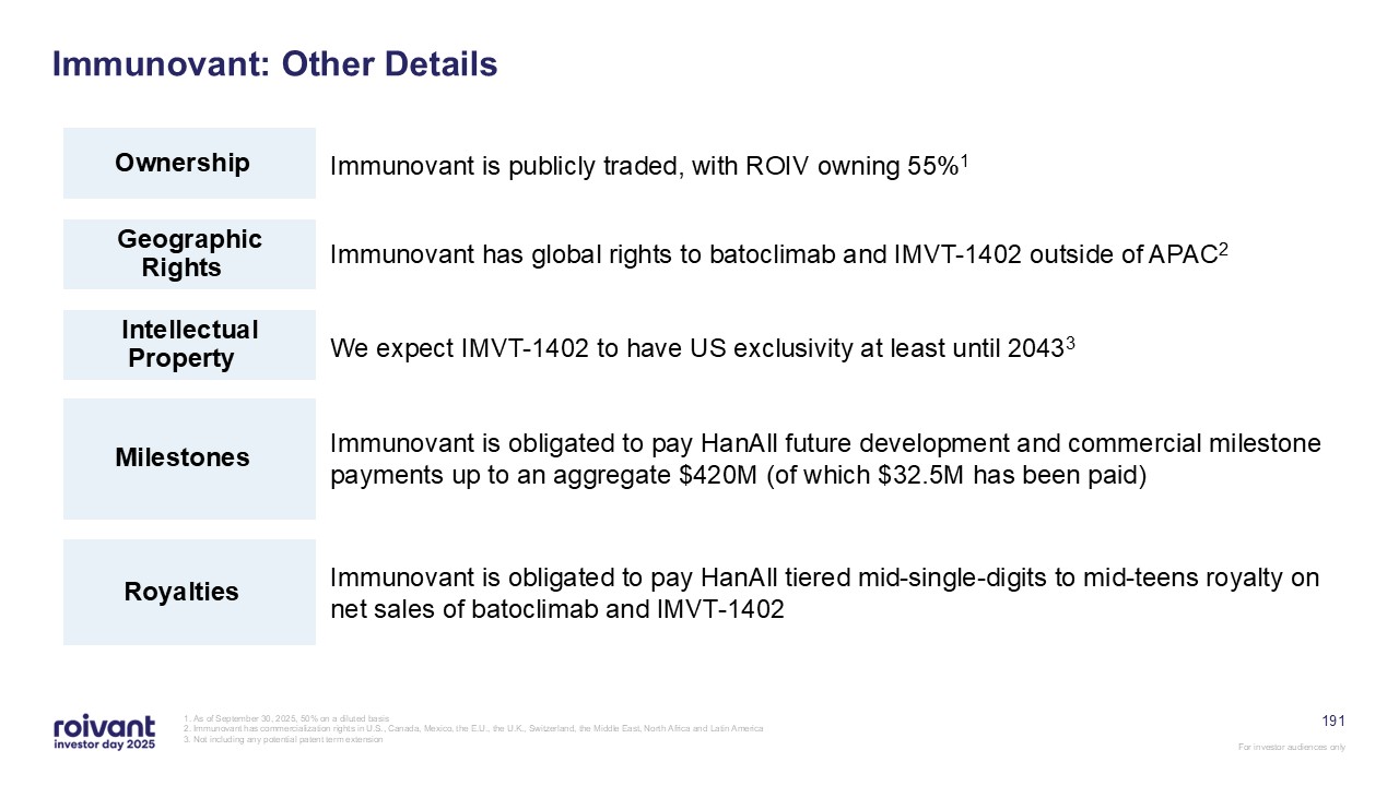 191  Immunovant: Other Details  Immunovant is publicly traded, with ROIV owning 55%1   Ownership    Geographic   Rights    Intellectual Property    Milestones    Royalties    1. As of September 30, 2025, 50% on a diluted basis  2. Immunovant has commercialization rights in U.S., Canada, Mexico, the E.U., the U.K., Switzerland, the Middle East, North Africa and Latin America  3. Not including any potential patent term extension   We expect IMVT-1402 to have US exclusivity at least until 20433    Immunovant has global rights to batoclimab and IMVT-1402 outside of APAC2  Immunovant is obligated to pay HanAll future development and commercial milestone payments up to an aggregate $420M (of which $32.5M has been paid)  Immunovant is obligated to pay HanAll tiered mid-single-digits to mid-teens royalty on net sales of batoclimab and IMVT-1402