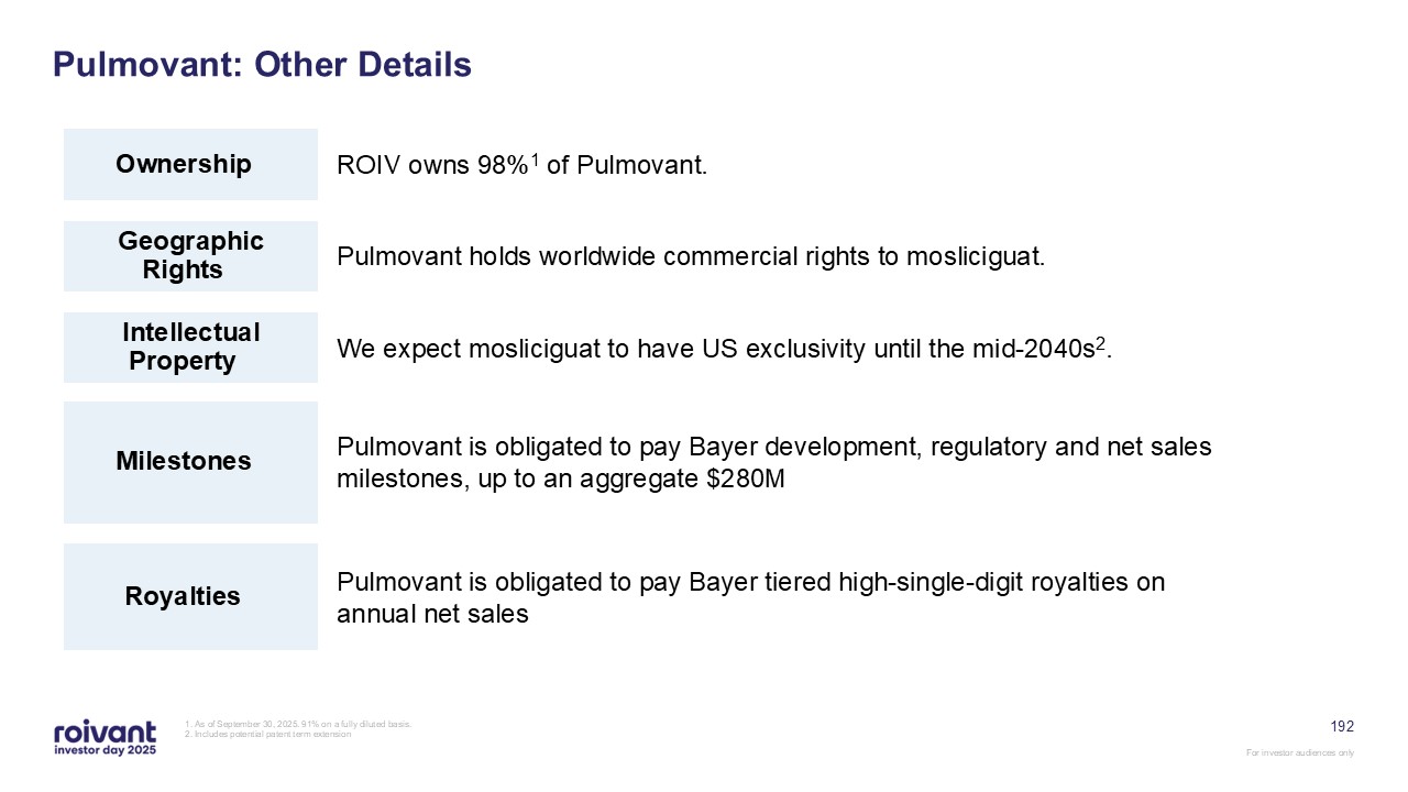 192  Pulmovant: Other Details  ROIV owns 98%1 of Pulmovant.  Ownership    Geographic   Rights    Intellectual Property    Milestones    Royalties    1. As of September 30, 2025. 91% on a fully diluted basis.  2. Includes potential patent term extension  We expect mosliciguat to have US exclusivity until the mid-2040s2.    Pulmovant holds worldwide commercial rights to mosliciguat.   Pulmovant is obligated to pay Bayer development, regulatory and net sales milestones, up to an aggregate $280M  Pulmovant is obligated to pay Bayer tiered high-single-digit royalties on annual net sales