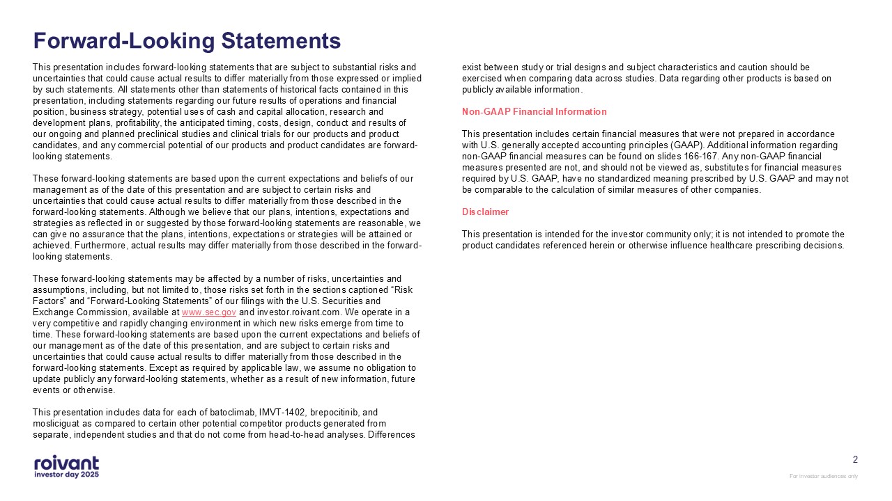 Forward-Looking Statements  This presentation includes forward-looking statements that are subject to substantial risks and uncertainties that could cause actual results to differ materially from those expressed or implied by such statements. All statements other than statements of historical facts contained in this presentation, including statements regarding our future results of operations and financial position, business strategy, potential uses of cash and capital allocation, research and development plans, profitability, the anticipated timing, costs, design, conduct and results of our ongoing and planned preclinical studies and clinical trials for our products and product candidates, and any commercial potential of our products and product candidates are forward-looking statements.  These forward-looking statements are based upon the current expectations and beliefs of our management as of the date of this presentation and are subject to certain risks and uncertainties that could cause actual results to differ materially from those described in the forward-looking statements. Although we believe that our plans, intentions, expectations and strategies as reflected in or suggested by those forward-looking statements are reasonable, we can give no assurance that the plans, intentions, expectations or strategies will be attained or achieved. Furthermore, actual results may differ materially from those described in the forward-looking statements.   These forward-looking statements may be affected by a number of risks, uncertainties and assumptions, including, but not limited to, those risks set forth in the sections captioned “Risk Factors” and “Forward-Looking Statements” of our filings with the U.S. Securities and Exchange Commission, available at www.sec.gov and investor.roivant.com. We operate in a very competitive and rapidly changing environment in which new risks emerge from time to time. These forward-looking statements are based upon the current expectations and beliefs of our management as of the date of this presentation, and are subject to certain risks and uncertainties that could cause actual results to differ materially from those described in the forward-looking statements. Except as required by applicable law, we assume no obligation to update publicly any forward-looking statements, whether as a result of new information, future events or otherwise.   This presentation includes data for each of batoclimab, IMVT-1402, brepocitinib, and mosliciguat as compared to certain other potential competitor products generated from separate, independent studies and that do not come from head-to-head analyses. Differences exist between study or trial designs and subject characteristics and caution should be exercised when comparing data across studies. Data regarding other products is based on publicly available information.  Non-GAAP Financial Information   This presentation includes certain financial measures that were not prepared in accordance with U.S. generally accepted accounting principles (GAAP). Additional information regarding non-GAAP financial measures can be found on slides 166-167. Any non-GAAP financial measures presented are not, and should not be viewed as, substitutes for financial measures required by U.S. GAAP, have no standardized meaning prescribed by U.S. GAAP and may not be comparable to the calculation of similar measures of other companies.  Disclaimer  This presentation is intended for the investor community only; it is not intended to promote the product candidates referenced herein or otherwise influence healthcare prescribing decisions.  2