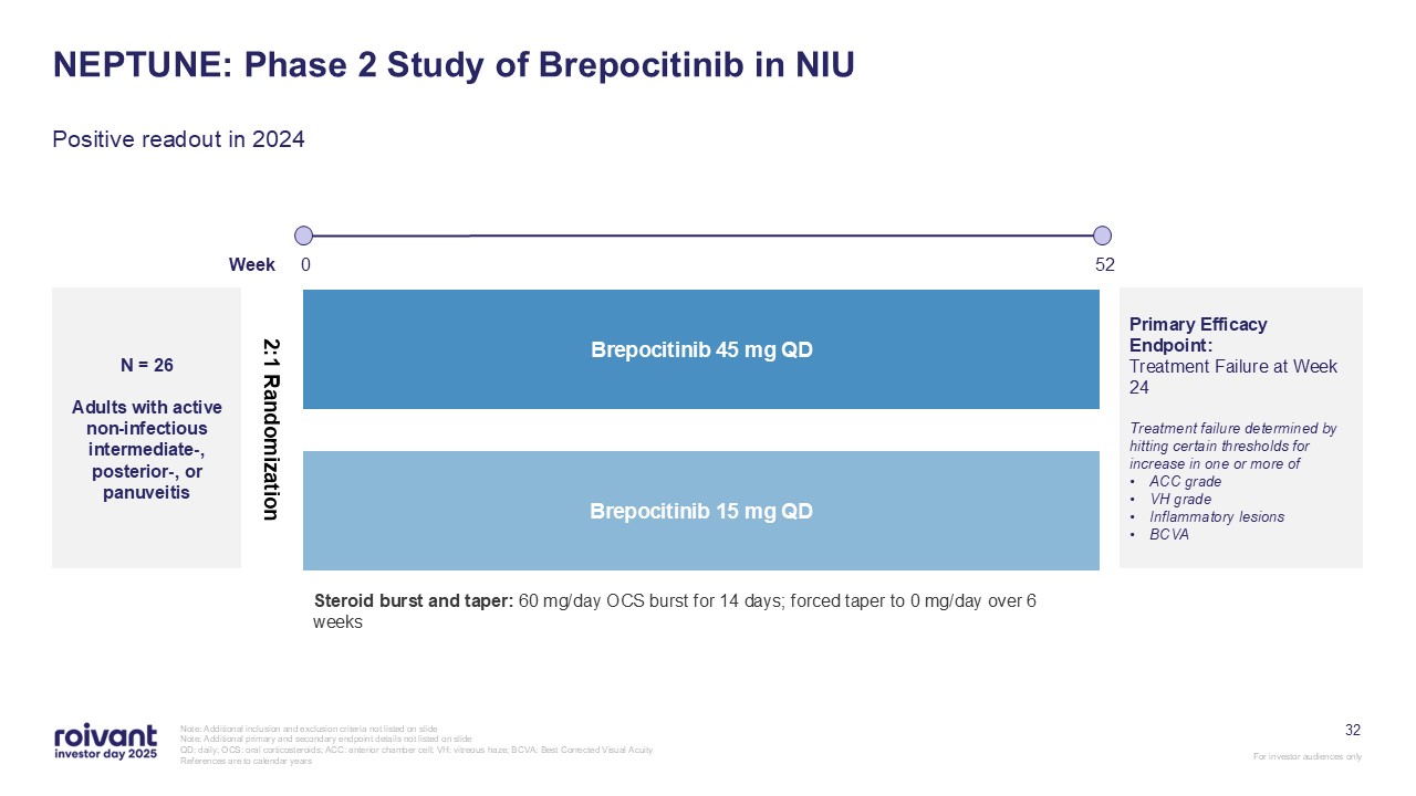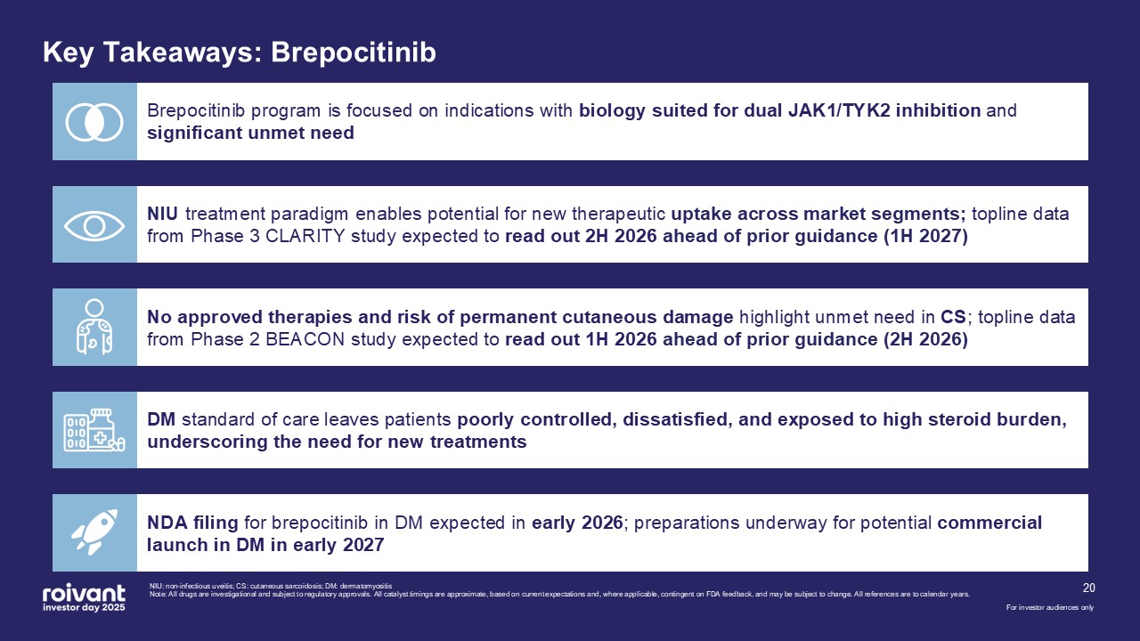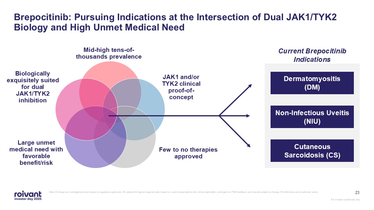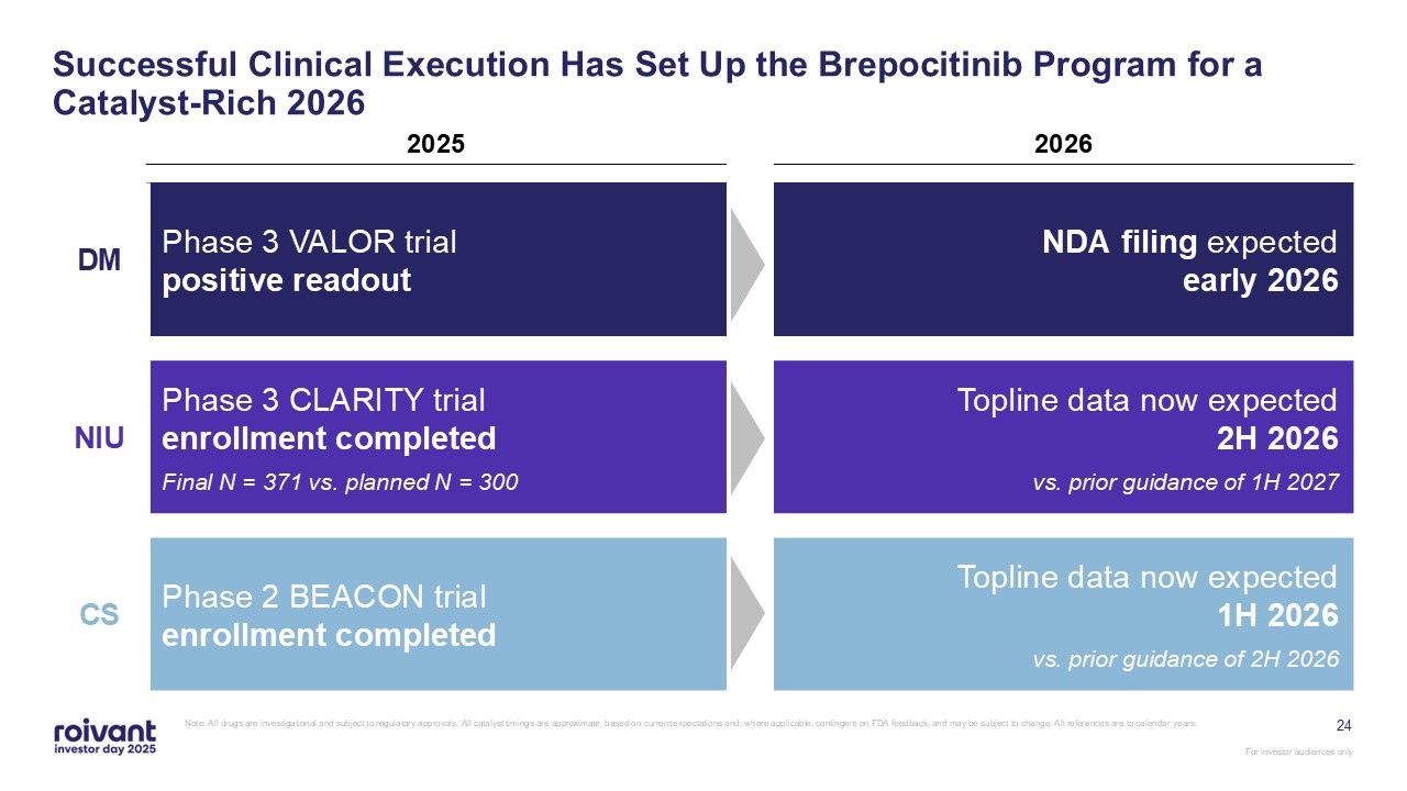 24  Successful Clinical Execution Has Set Up the Brepocitinib Program for a Catalyst-Rich 2026  Note: All drugs are investigational and subject to regulatory approvals. All catalyst timings are approximate, based on current expectations and, where applicable, contingent on FDA feedback, and may be subject to change. All references are to calendar years.  2025  2026  DM  Phase 3 VALOR trial positive readout  NDA filing expected early 2026  NIU  Phase 3 CLARITY trial enrollment completed  Final N = 371 vs. planned N = 300  Topline data now expected 2H 2026  vs. prior guidance of 1H 2027   CS  Phase 2 BEACON trial enrollment completed  Topline data now expected 1H 2026  vs. prior guidance of 2H 2026