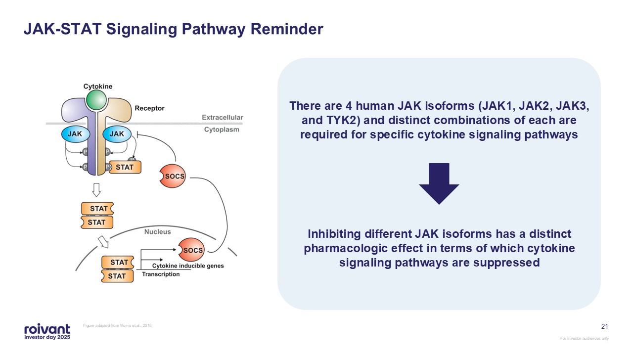 JAK-STAT Signaling Pathway Reminder  Figure adapted from Morris et al., 2018  21  There are 4 human JAK isoforms (JAK1, JAK2, JAK3, and TYK2) and distinct combinations of each are required for specific cytokine signaling pathways   Inhibiting different JAK isoforms has a distinct pharmacologic effect in terms of which cytokine signaling pathways are suppressed