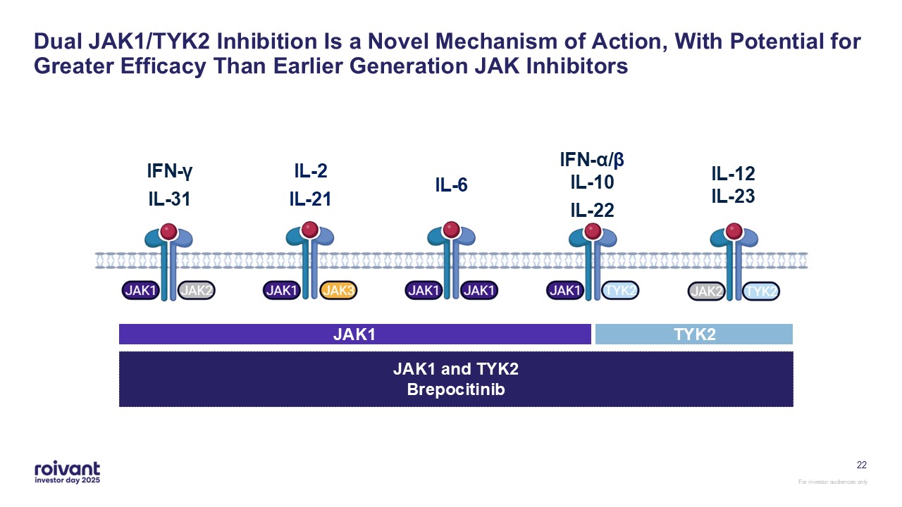 Dual JAK1/TYK2 Inhibition Is a Novel Mechanism of Action, With Potential for Greater Efficacy Than Earlier Generation JAK Inhibitors   IFN-γ  IL-31  IL-2  IL-21  IL-6  IFN-α/βIL-10  IL-22  IL-12IL-23  JAK1 and TYK2Brepocitinib  JAK1  TYK2  22