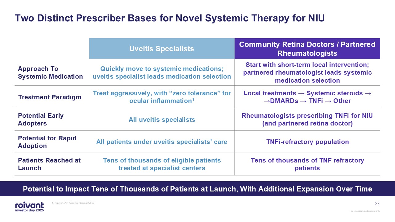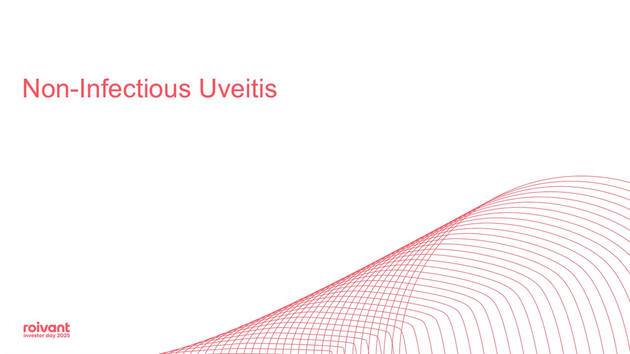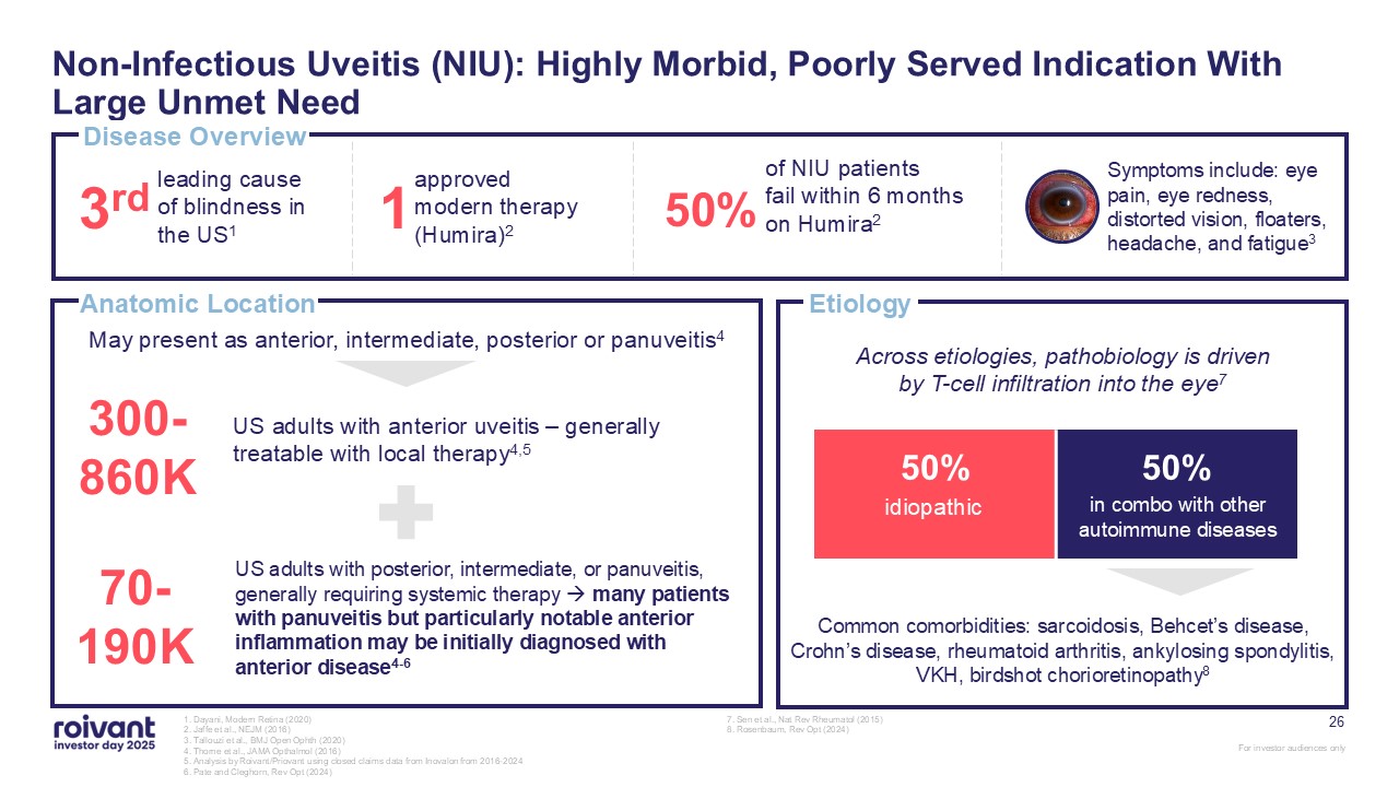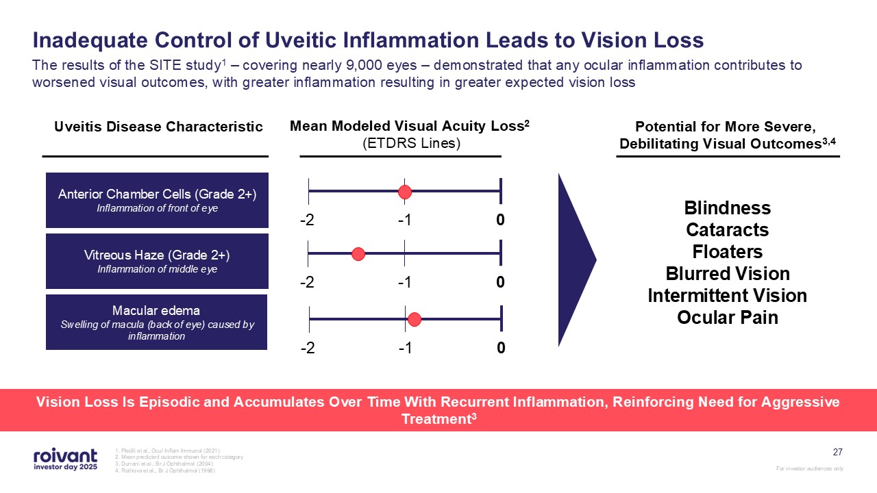 26  Non-Infectious Uveitis (NIU): Highly Morbid, Poorly Served Indication With Large Unmet Need  1. Dayani, Modern Retina (2020)   2. Jaffe et al., NEJM (2016)  3. Tallouzi et al., BMJ Open Ophth (2020)  4. Thorne et al., JAMA Opthalmol (2016)  5. Analysis by Roivant/Priovant using closed claims data from Inovalon from 2016-2024  6. Pate and Cleghorn, Rev Opt (2024)  7. Sen et al., Nat Rev Rheumatol (2015)  8. Rosenbaum, Rev Opt (2024)  Disease Overview  Anatomic Location  3rd   leading cause of blindness in the US1  1  approved modern therapy (Humira)2  50%  of NIU patients fail within 6 months on Humira2  300-860K   US adults with anterior uveitis – generally treatable with local therapy4,5  70-190K  US adults with posterior, intermediate, or panuveitis, generally requiring systemic therapy  many patients with panuveitis but particularly notable anterior inflammation may be initially diagnosed with anterior disease4-6  May present as anterior, intermediate, posterior or panuveitis4  Etiology  50%  50%  Common comorbidities: sarcoidosis, Behcet’s disease, Crohn’s disease, rheumatoid arthritis, ankylosing spondylitis, VKH, birdshot chorioretinopathy8   idiopathic  in combo with other autoimmune diseases  Across etiologies, pathobiology is driven by T-cell infiltration into the eye7  Symptoms include: eye pain, eye redness, distorted vision, floaters, headache, and fatigue3