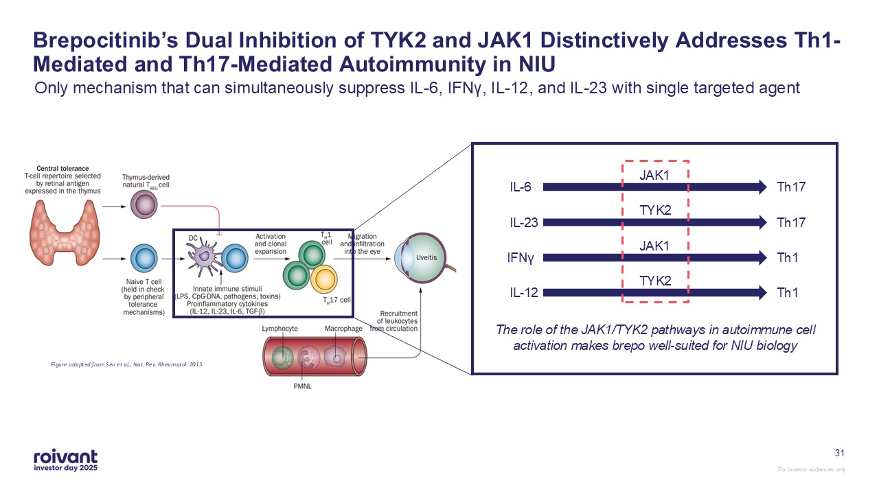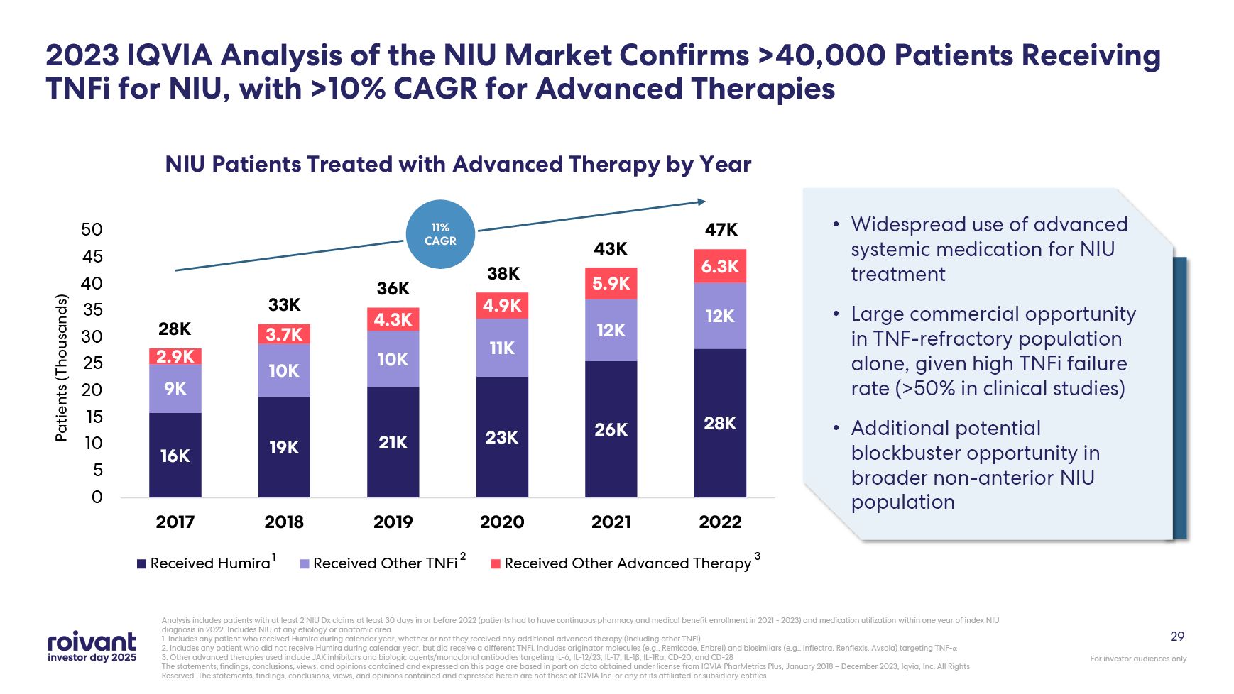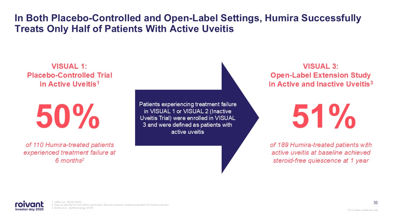 26  Non-Infectious Uveitis (NIU): Highly Morbid, Poorly Served Indication With Large Unmet Need  1. Dayani, Modern Retina (2020)   2. Jaffe et al., NEJM (2016)  3. Tallouzi et al., BMJ Open Ophth (2020)  4. Thorne et al., JAMA Opthalmol (2016)  5. Analysis by Roivant/Priovant using closed claims data from Inovalon from 2016-2024  6. Pate and Cleghorn, Rev Opt (2024)  7. Sen et al., Nat Rev Rheumatol (2015)  8. Rosenbaum, Rev Opt (2024)  Disease Overview  Anatomic Location  3rd   leading cause of blindness in the US1  1  approved modern therapy (Humira)2  50%  of NIU patients fail within 6 months on Humira2  300-860K   US adults with anterior uveitis – generally treatable with local therapy4,5  70-190K  US adults with posterior, intermediate, or panuveitis, generally requiring systemic therapy  many patients with panuveitis but particularly notable anterior inflammation may be initially diagnosed with anterior disease4-6  May present as anterior, intermediate, posterior or panuveitis4  Etiology  50%  50%  Common comorbidities: sarcoidosis, Behcet’s disease, Crohn’s disease, rheumatoid arthritis, ankylosing spondylitis, VKH, birdshot chorioretinopathy8   idiopathic  in combo with other autoimmune diseases  Across etiologies, pathobiology is driven by T-cell infiltration into the eye7  Symptoms include: eye pain, eye redness, distorted vision, floaters, headache, and fatigue3