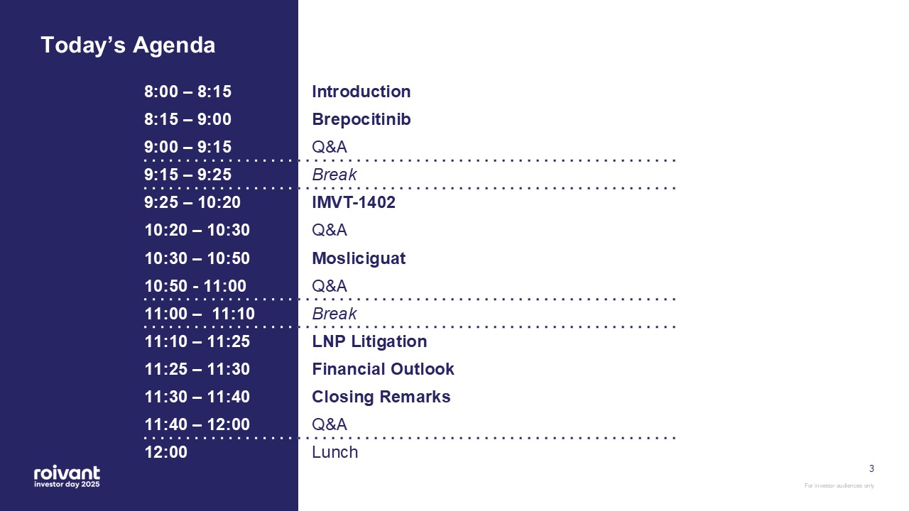 Today’s Agenda  8:00 – 8:15  Introduction  8:15 – 9:00  Brepocitinib  9:00 – 9:15  Q&A  9:15 – 9:25  Break  9:25 – 10:20  IMVT-1402  10:20 – 10:30  Q&A  10:30 – 10:50  Mosliciguat  10:50 - 11:00  Q&A  11:00 – 11:10  Break  11:10 – 11:25  LNP Litigation  11:25 – 11:30  Financial Outlook  11:30 – 11:40  Closing Remarks  11:40 – 12:00  Q&A  12:00  Lunch  For investor audiences only  3